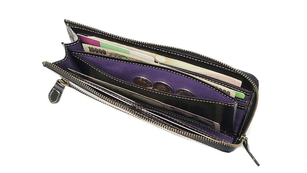 収納部は大きく開くため内部の可視性抜群。本体の中央には小銭入れを設けており、その両サイドに紙幣を種別管理しておくことができます。また、カードポケットは12ヶ所と豊富に備わっているため、クレジットカードからポイントカードまで重ねずにすっきり収納可能です。