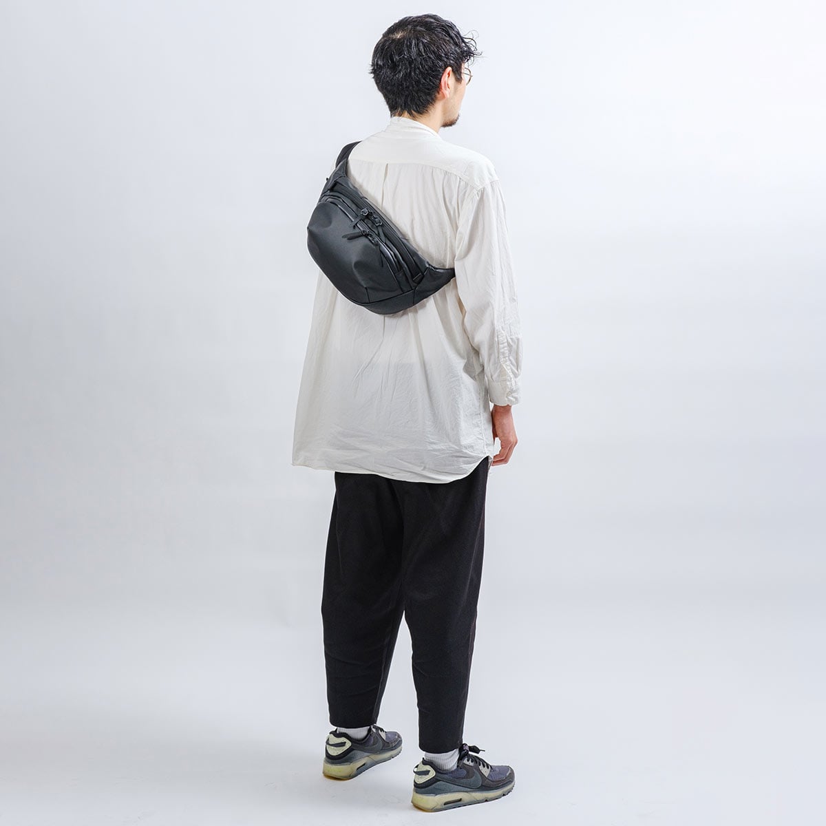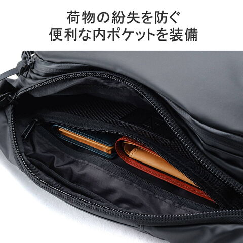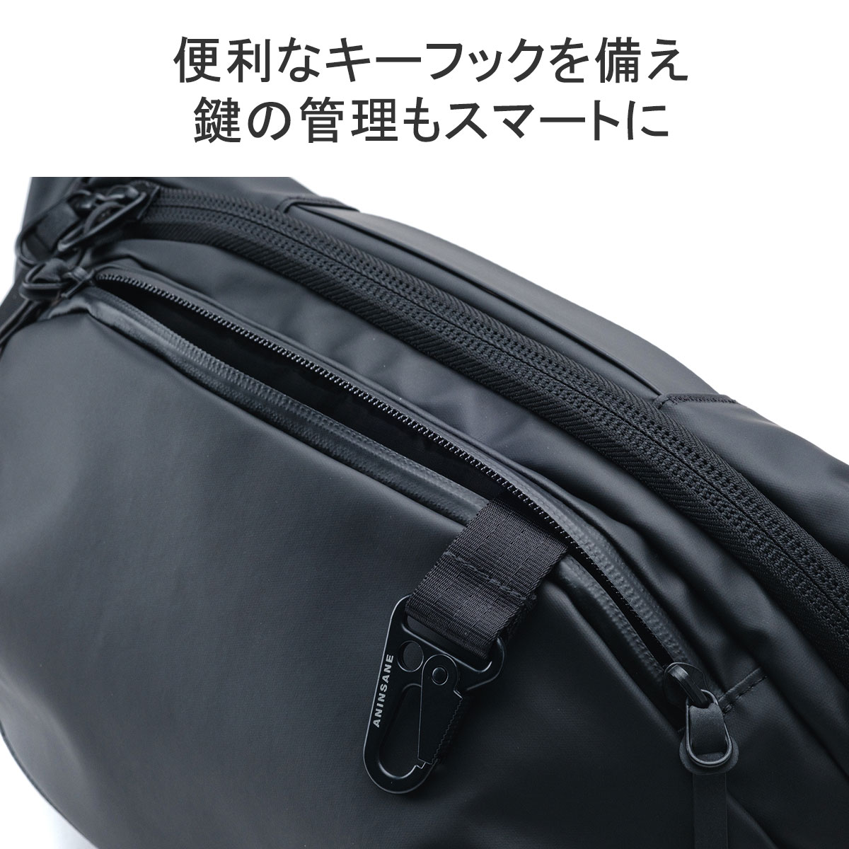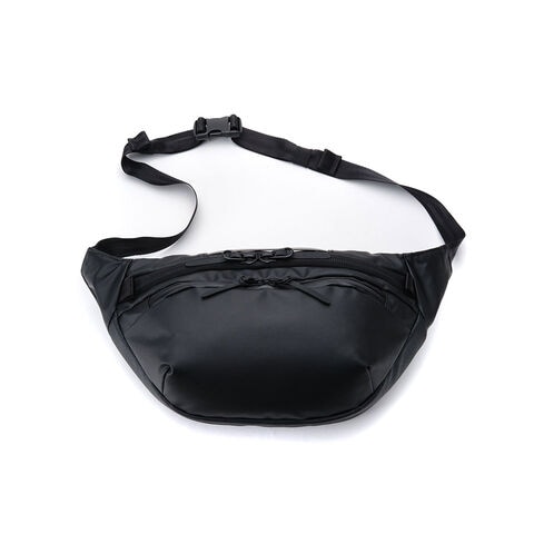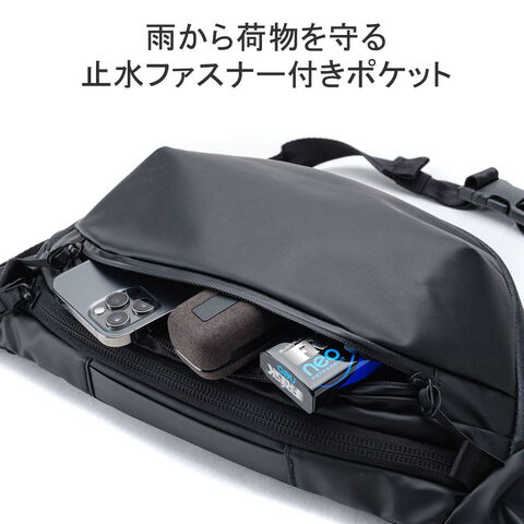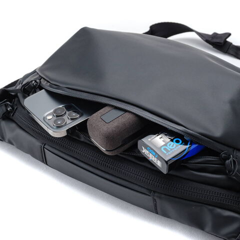 休日シーンを中心に持ち歩くアイテムをリサーチしたうえで、何をどこにしまうか計算しつくされた収納配置が魅力のボディバッグ。メイン生地は完全オリジナルで、コーデュラナイロンの強さに加え、圧倒的な耐水圧を誇るポリカーボネート加工を施した、雨や汚れに強い仕上がりとなっています。(耐水圧60000mm以上)裏地には、丈夫で引き裂きに強く、ペットボトルを100%リサイクルしたエコ素材を使用したこだわりの設計。名だたるブランドのOEM・ODM(企画・生産)を手掛けた老舗バッグメーカーが捧げる、外出のお供に最適なハイスペックモデルです。
