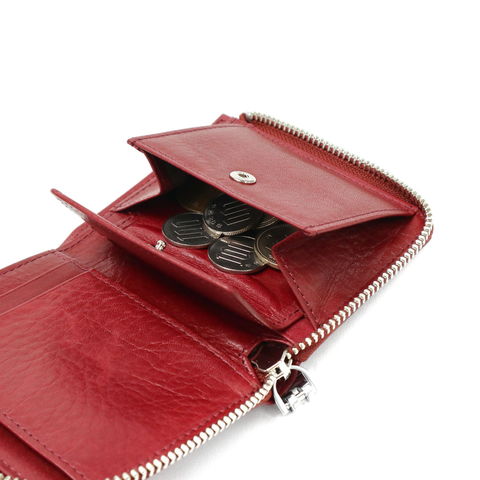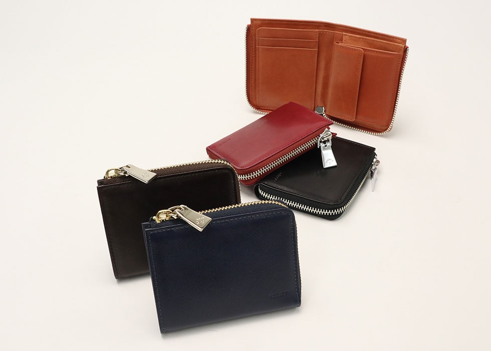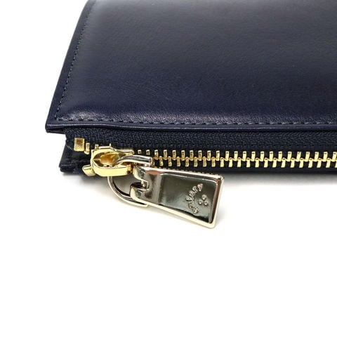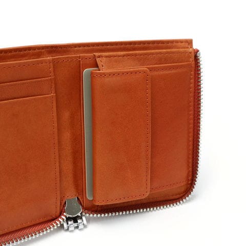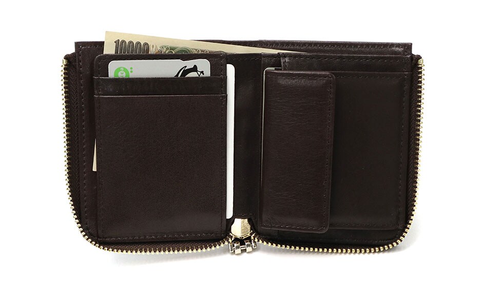 L字ファスナー式の本体は、二つ折りのため内部の視認性に優れています。ジャケットのポケットにも収まるコンパクトなサイズ感ながら、お札、カード、小銭がしっかり収納可能。必要アイテムをすっきりと管理できる設計になっているため、お財布の中身は最小限に抑えたいという方にもオススメです。