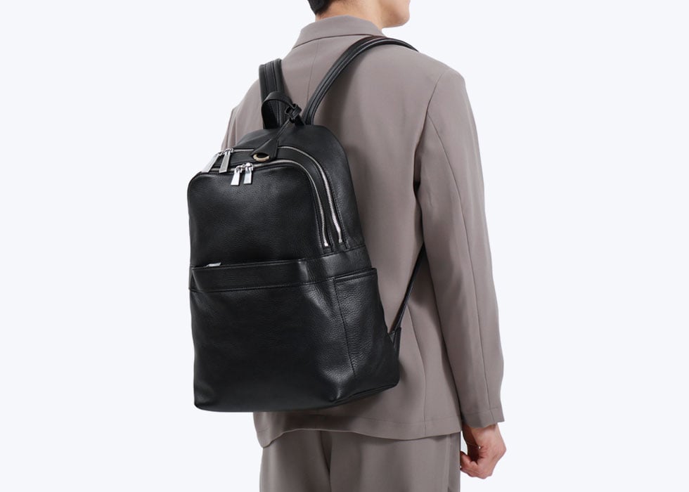 エレガントで豊かな表情が楽しめる『Shrink Leather』を贅沢に使用したバックパック。カジュアルなイメージのバックパックもレザーで仕立てることで上品かつ洗練された印象になり、シティーユーザーにオススメしたい逸品です。また、素材を極限まで薄く漉いているため、見た目以上に軽くお待ちいただけます。