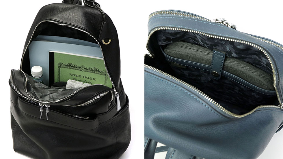 収納部はA4サイズに対応し、メイン収納とサブ収納の2層構造となっております。マチ幅がしっかりと設けられ、広々としたスペースとなっていますのでお仕事で使用するアイテムと、貴重品やポーチ類などのプライベートアイテムを仕分けて持ち歩くことが可能です。