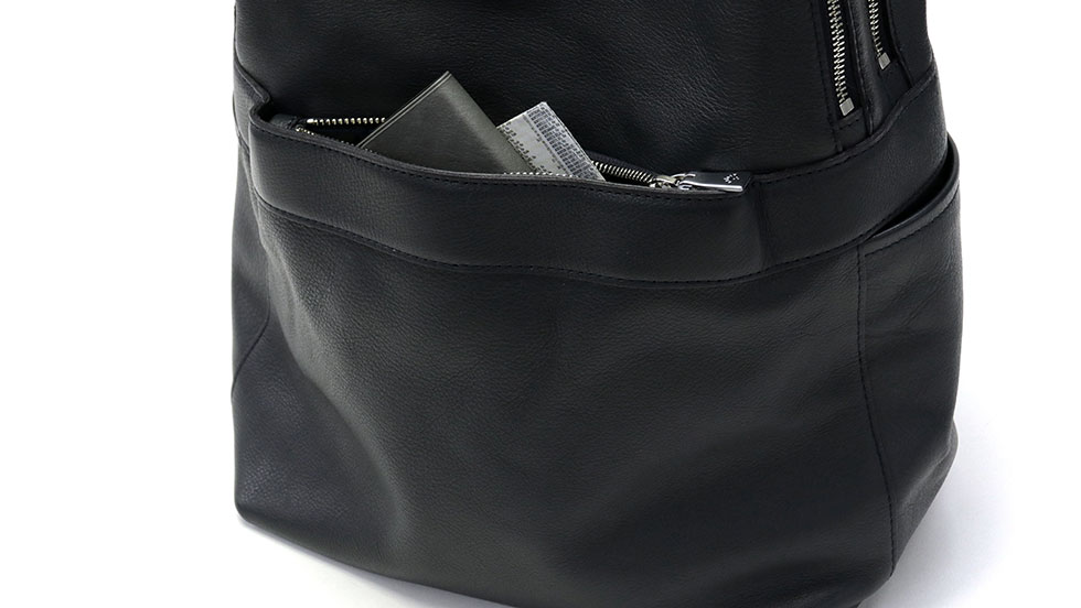 本体外側には前面とサイドにポケットを装備。スマートフォンやパスケース、ドリンクボトルなどのさっと手にしたいアイテムの保管に役立ちます。メイン収納を探したりすることもないので、スマートな身のこなしのサポートとなりそうです。