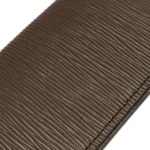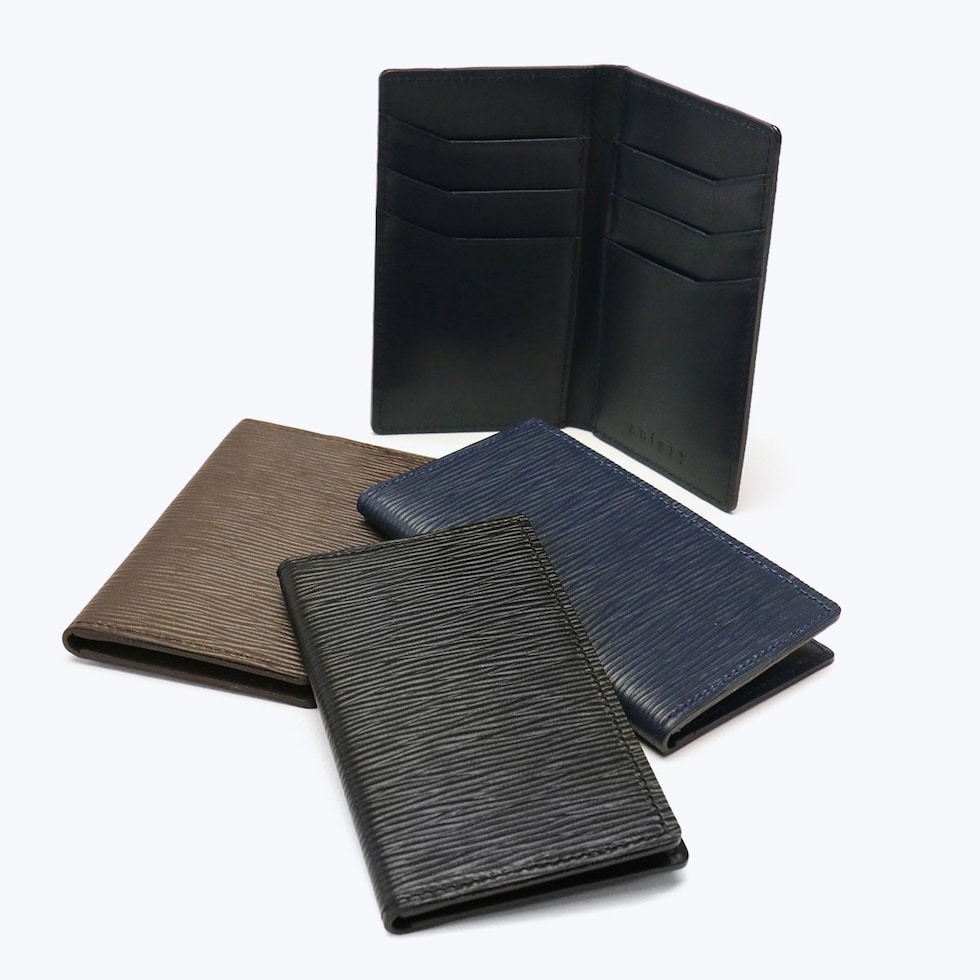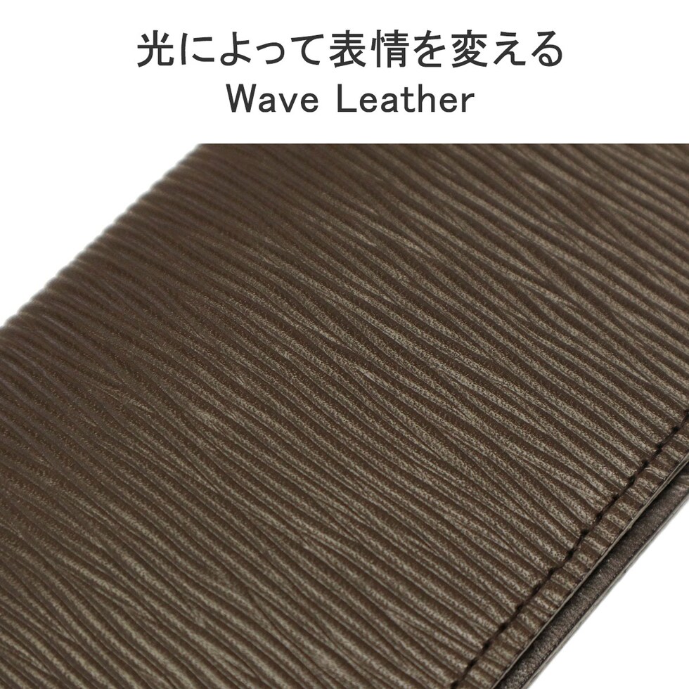 光のあたる海面を感じさせる「ウェーブレザー」シリーズのカードケース。ポイントはワックスとアイロン工程によるツヤ出し加工で、海面に光があたる様を表現。さらに波の型押しを加えることにより、凹凸部で光沢の差を出しています。カード入れは外側への飛び出しを防ぐため、端に向かってレザー面積を増やした実用的な設計に。またポケットを2つ搭載しており、お札等も折り畳んで持ち運ぶことができます。