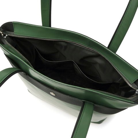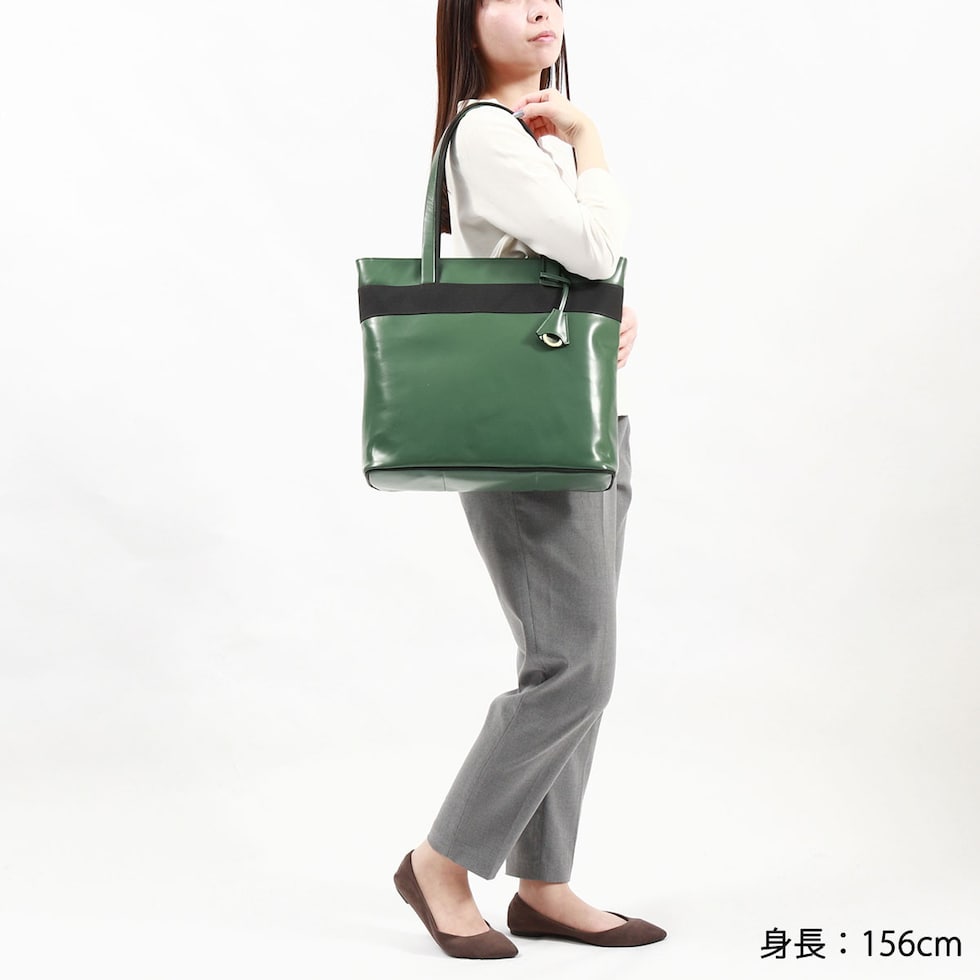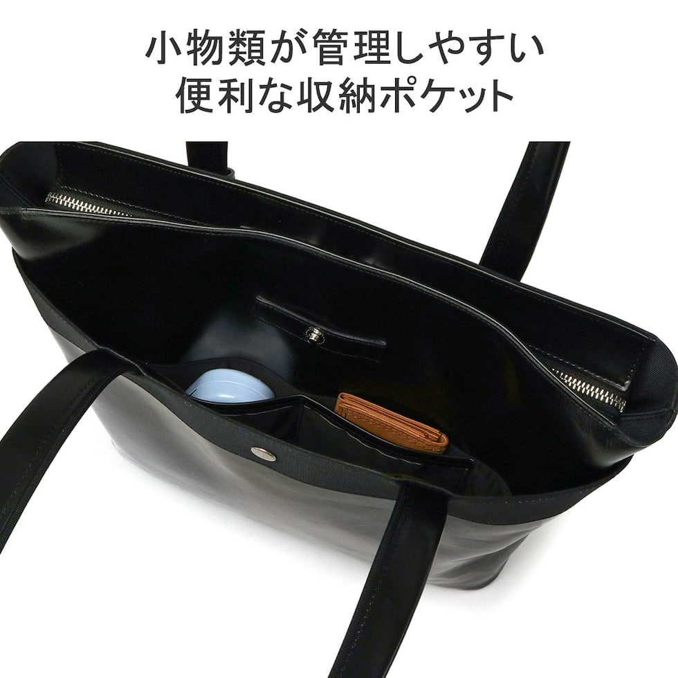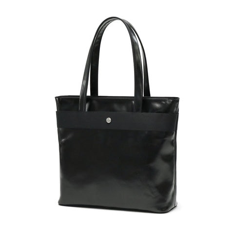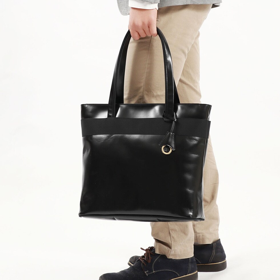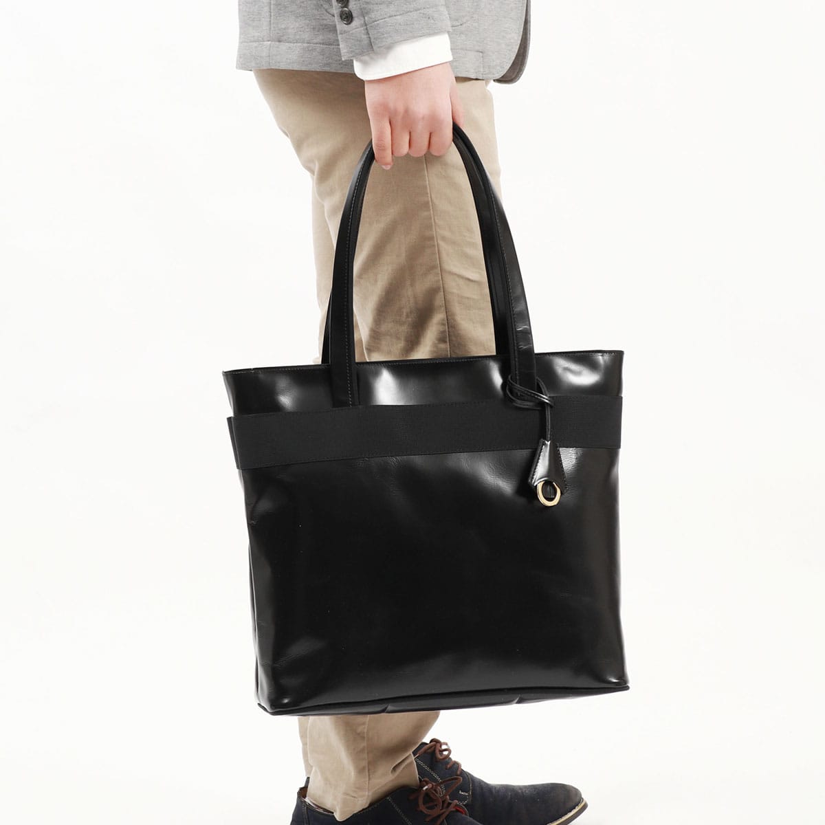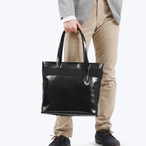 リアルレザーに特殊加工を施すことで、革本来のしなやかさを残しつつ機能性も兼ね備えた「エフ-フィルムレザー」のトートバッグ。表面に傷がつきにくく、耐水性・耐熱性なども備えたタフな仕上がりが魅力です。さらに、新鮮なスクエア型と大胆に施されたテープで一味違うルックスに。ハンドルは長めに設計されており、男女問わず使いやすいデザインとなっています。