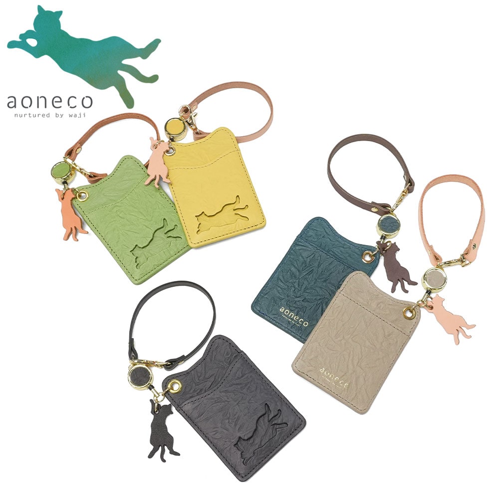 アオネコ パスケース aoneco リール付き 定期入れ ICカードケース IDケース かわいい オフィス 通勤 通学 可愛い 革 本革 牛革 レザー 猫 ネコ 保護猫 保護ネコ ねこ 日本製 リール付きパスケース 軽量 軽い