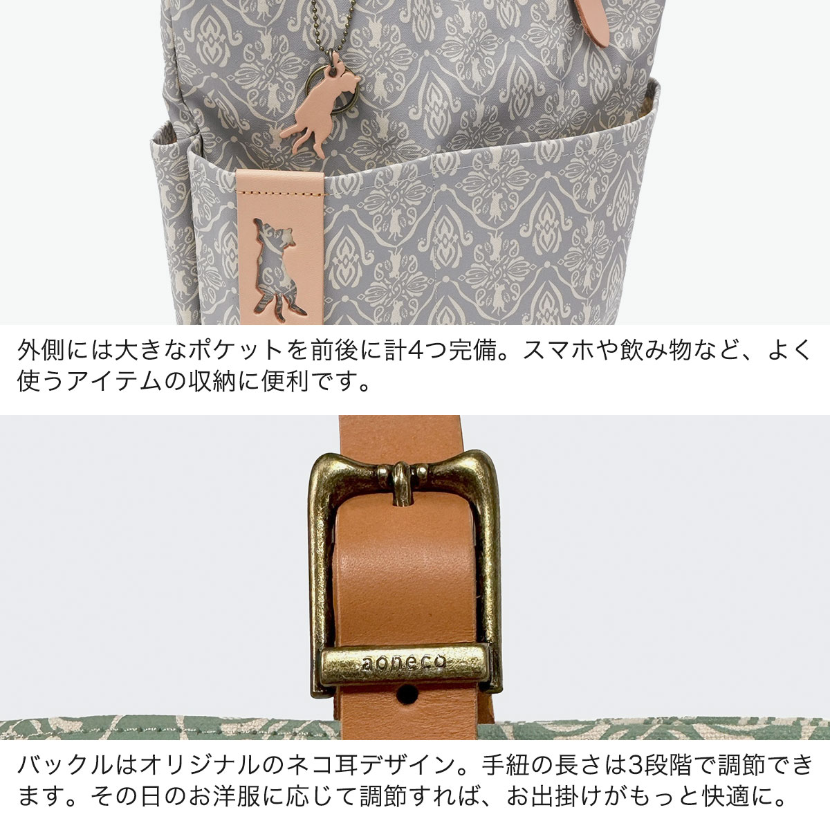 「全てのネコが隙だらけに眠れますように」という願いを込めたブランド『aoneco』のバケットトートバッグ。職人が丁寧に仕上げたオリジナルのダマスク柄には、さりげなくネコのモチーフが潜んでいます。A4サイズで使い勝手がよく、ネコ耳型のバックルや国産ヌメ革のチャームなど、大人可愛いアクセントも魅力です。付属のチケットから誰でも簡単に寄付を贈ることができ、商品代金の約10%が保護ネコ施設へ寄付される透明性の高い仕組みがポイント。猫と人の幸せな未来を支援する、新しい形のプロジェクトです。