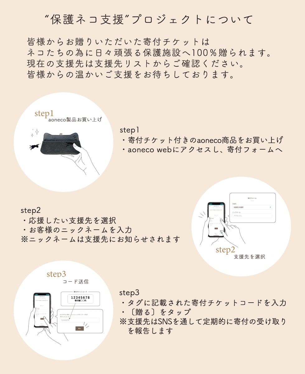 「全てのネコが隙だらけに眠れますように」という願いを込めたブランド『aoneco』のバケットショルダー。職人が丁寧に仕上げたオリジナルのダマスク柄には、さりげなくネコのモチーフが潜んでいます。ちょっとしたお出かけに最適なサイズ感で、ネコ耳型のバックルや国産ヌメ革のチャームなど、大人可愛いアクセントも魅力です。付属のチケットから誰でも簡単に寄付を贈ることができ、商品代金の約10%が保護ネコ施設へ寄付される透明性の高い仕組みがポイント。猫と人の幸せな未来を支援する、新しい形のプロジェクトです。