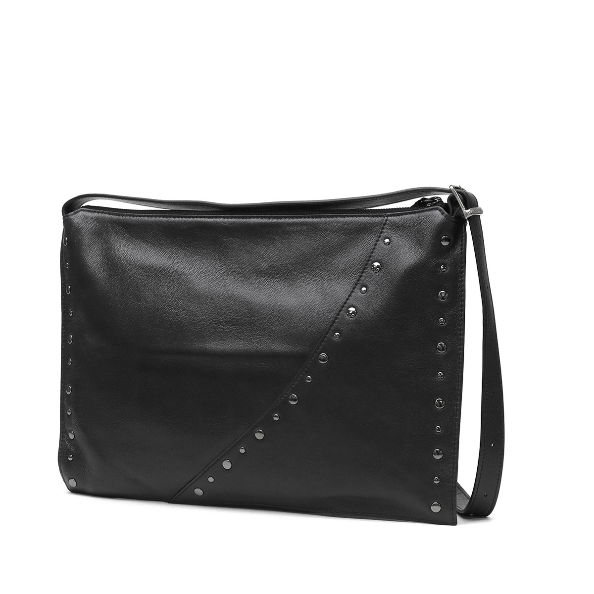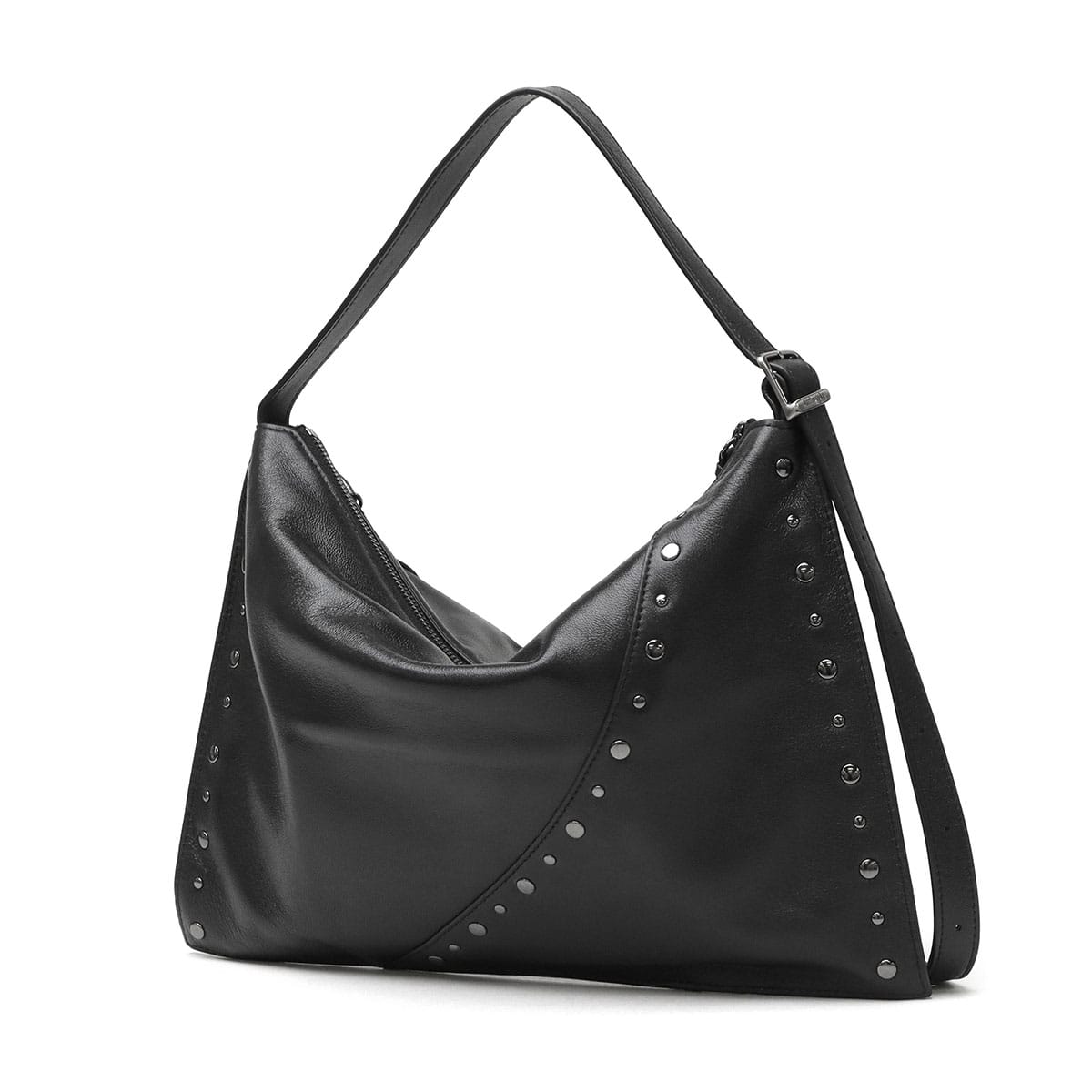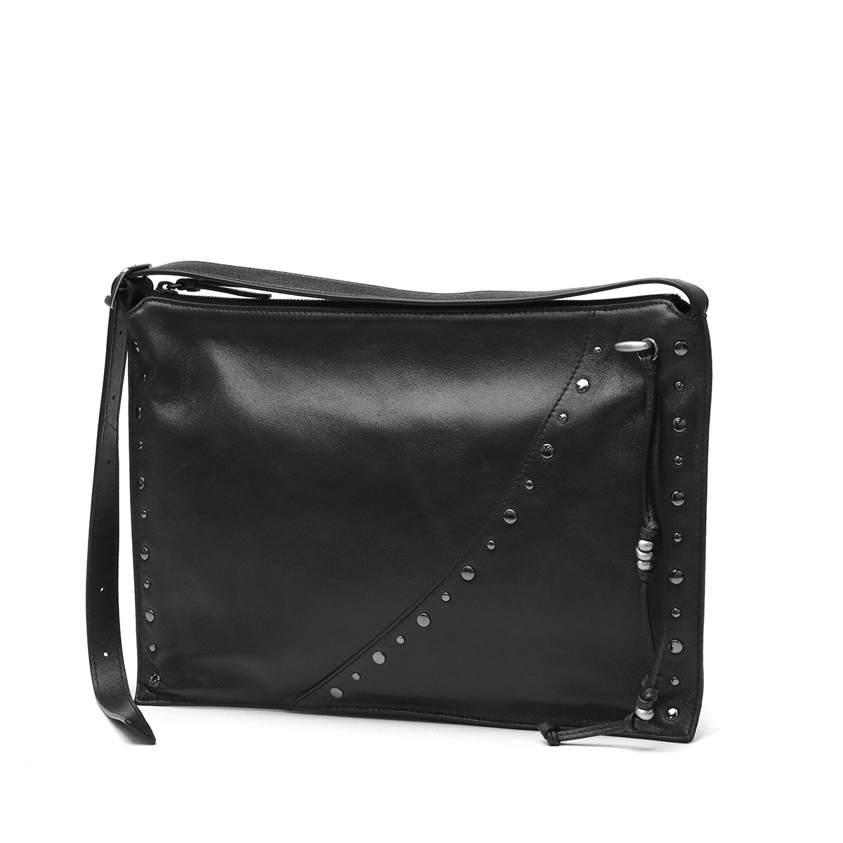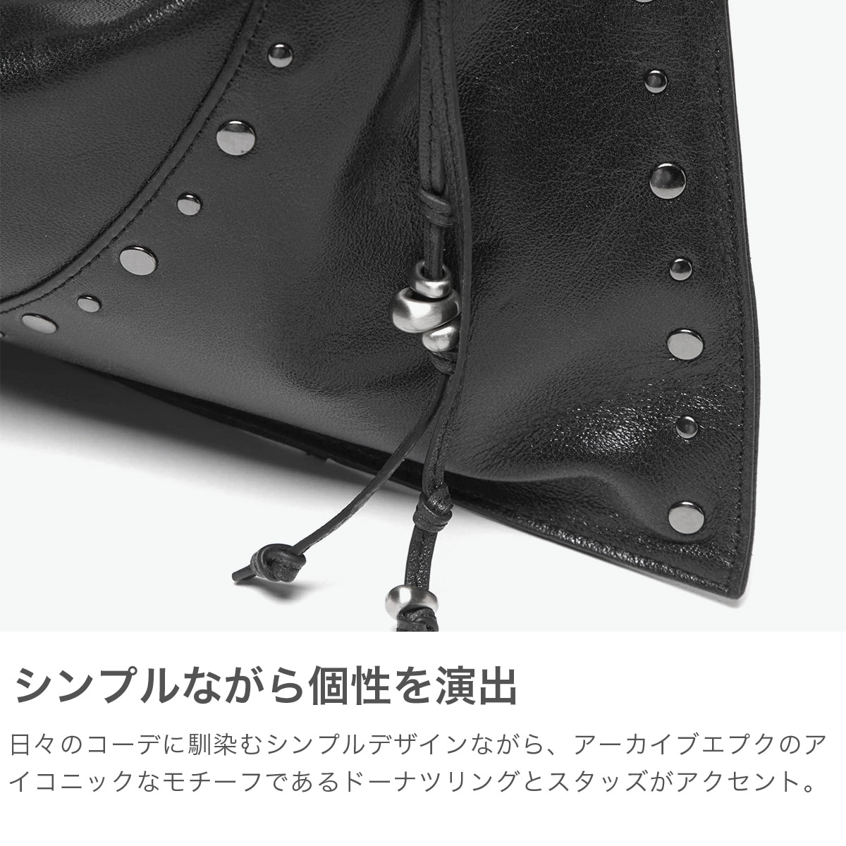 マチのないすっきりとしたデザインのトートバッグ。シンプルな形に、スタッズ使いやアクセサリーで個性をプラスしています。素材は柔らかな羊革を使用し、持った時に中央が窪むようなユニークなつくり。荷物量によっても様々な表情が楽しめる、雰囲気のあるバッグです。