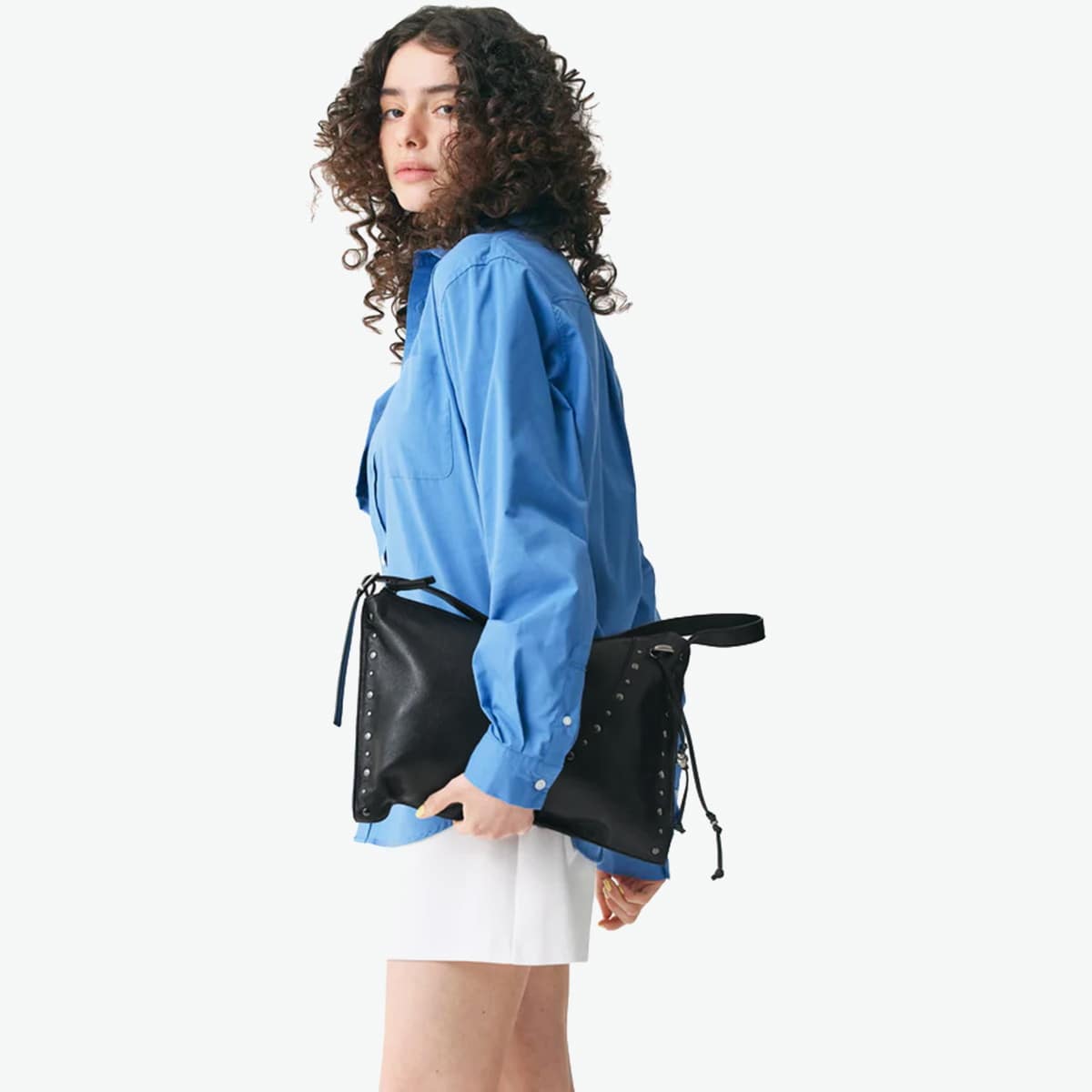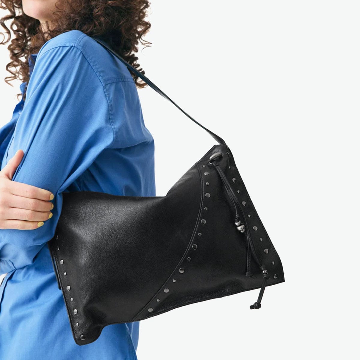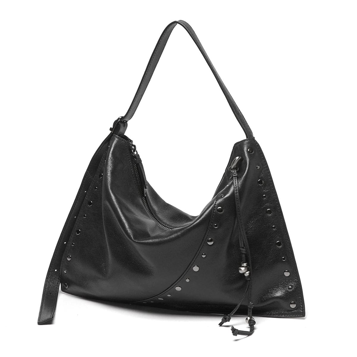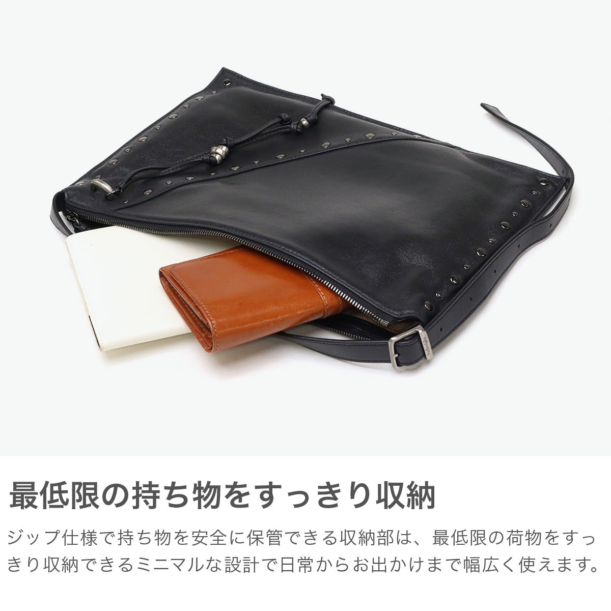 マチのないすっきりとしたデザインのトートバッグ。シンプルな形に、スタッズ使いやアクセサリーで個性をプラスしています。素材は柔らかな羊革を使用し、持った時に中央が窪むようなユニークなつくり。荷物量によっても様々な表情が楽しめる、雰囲気のあるバッグです。