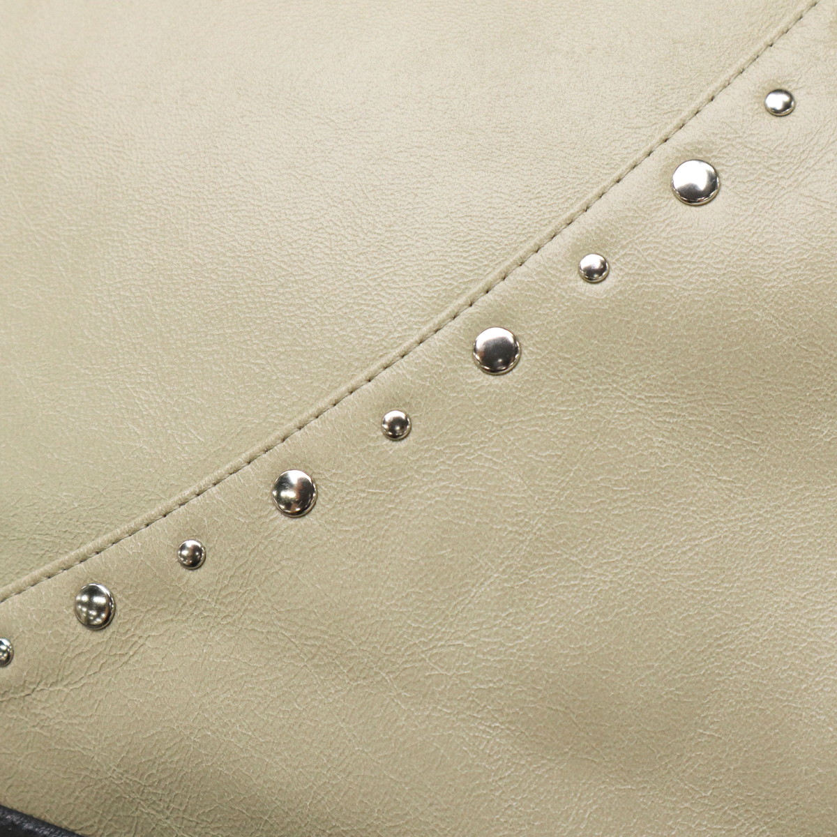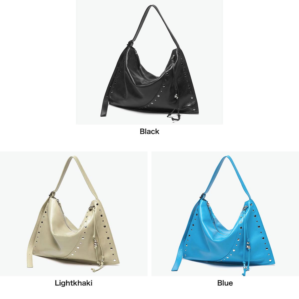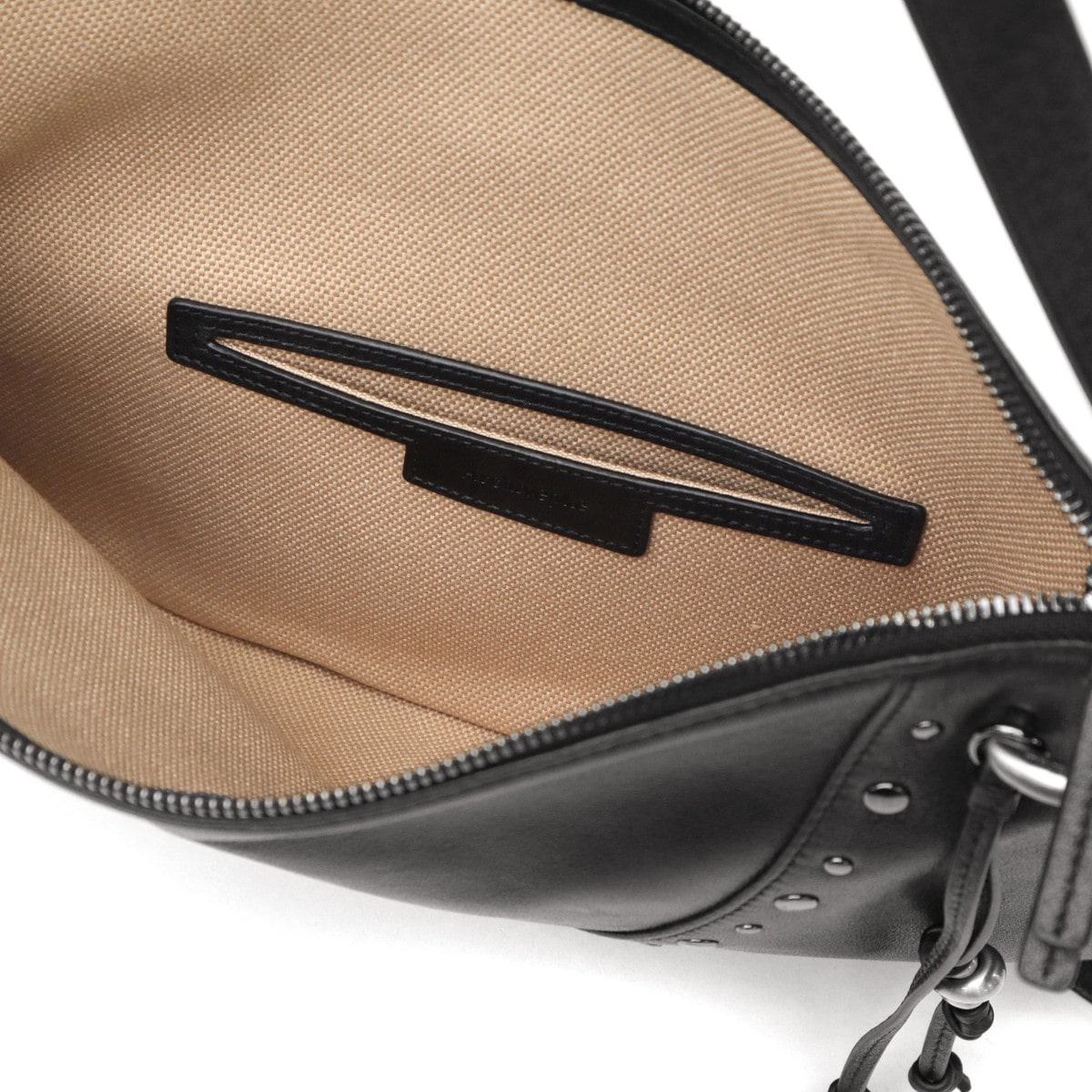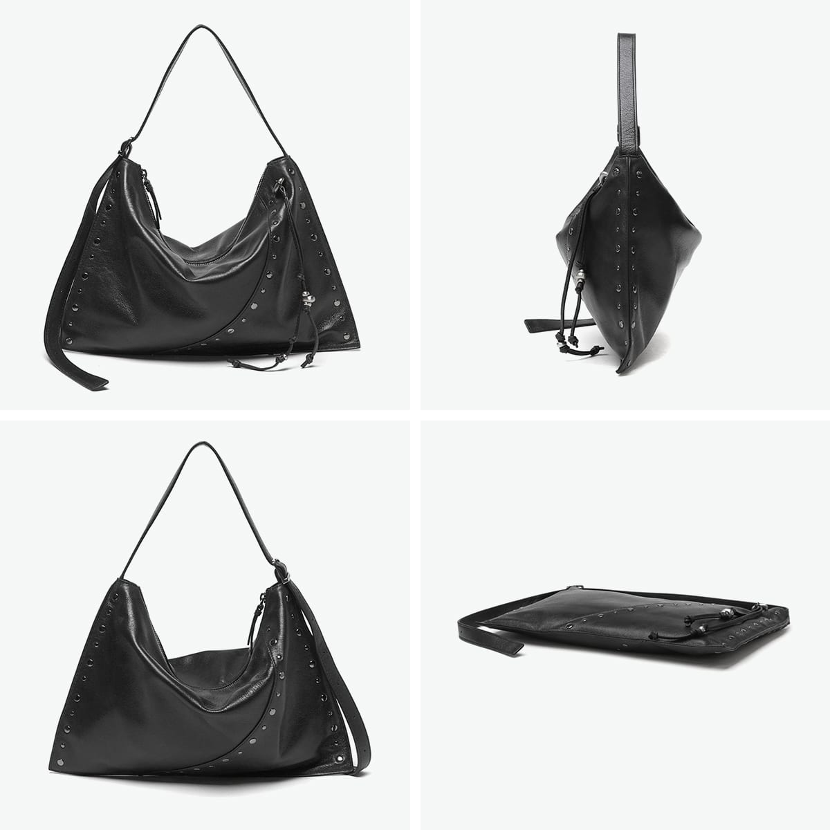 マチのないすっきりとしたデザインのトートバッグ。シンプルな形に、スタッズ使いやアクセサリーで個性をプラスしています。素材は柔らかな羊革を使用し、持った時に中央が窪むようなユニークなつくり。荷物量によっても様々な表情が楽しめる、雰囲気のあるバッグです。