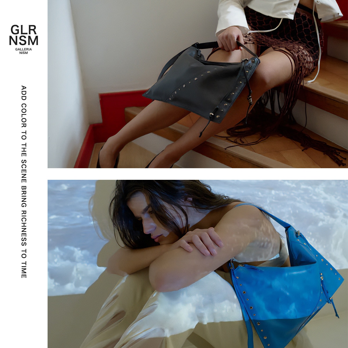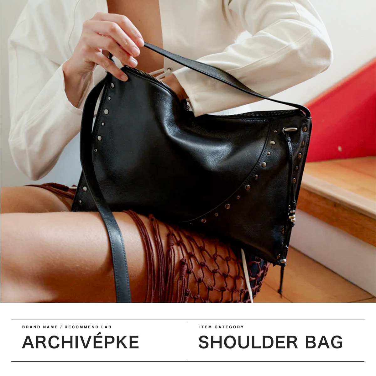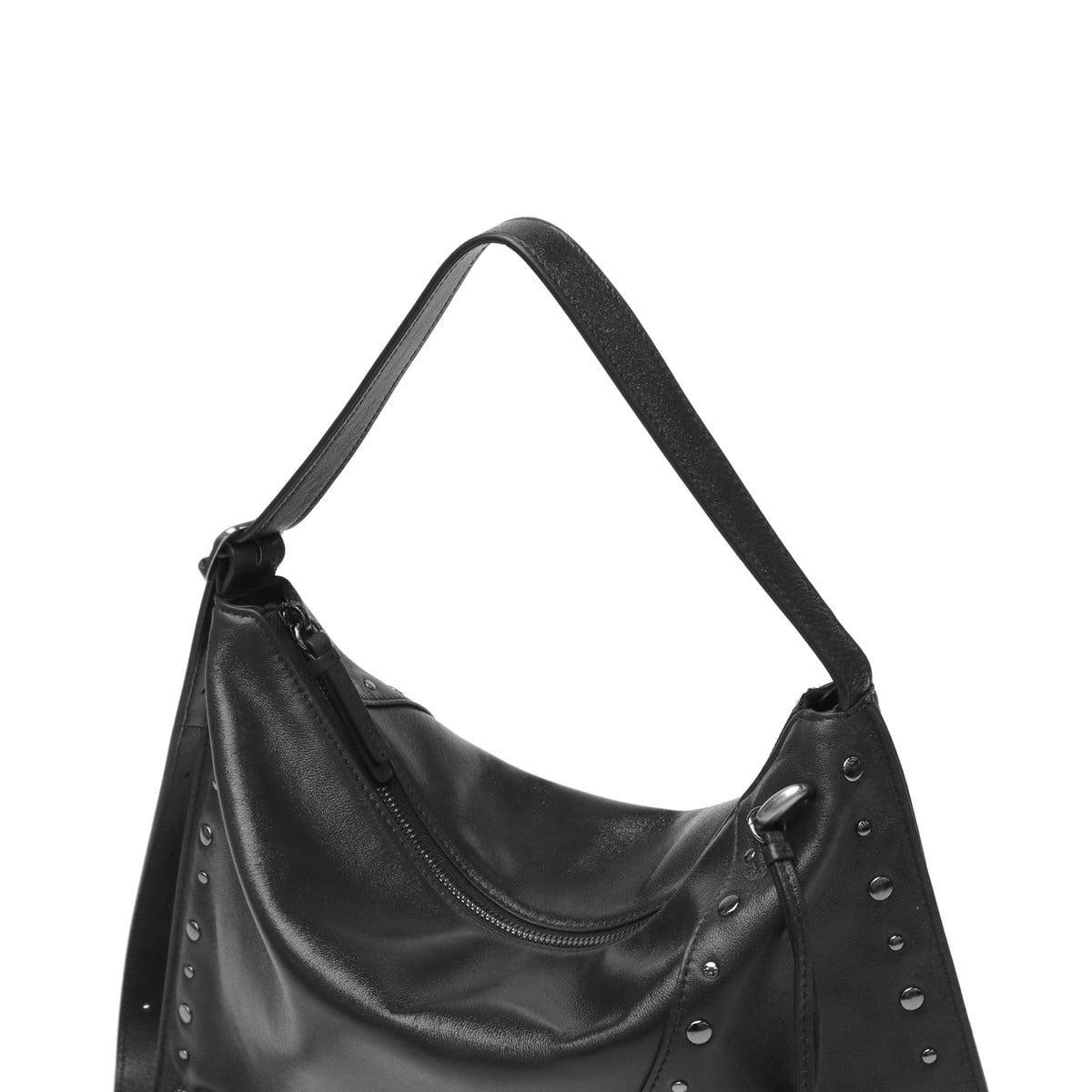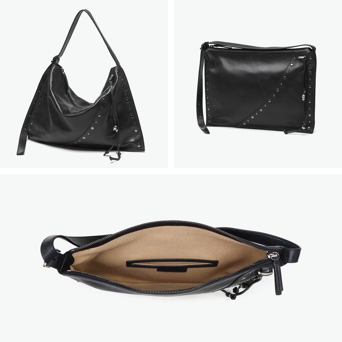 マチのないすっきりとしたデザインのトートバッグ。シンプルな形に、スタッズ使いやアクセサリーで個性をプラスしています。素材は柔らかな羊革を使用し、持った時に中央が窪むようなユニークなつくり。荷物量によっても様々な表情が楽しめる、雰囲気のあるバッグです。