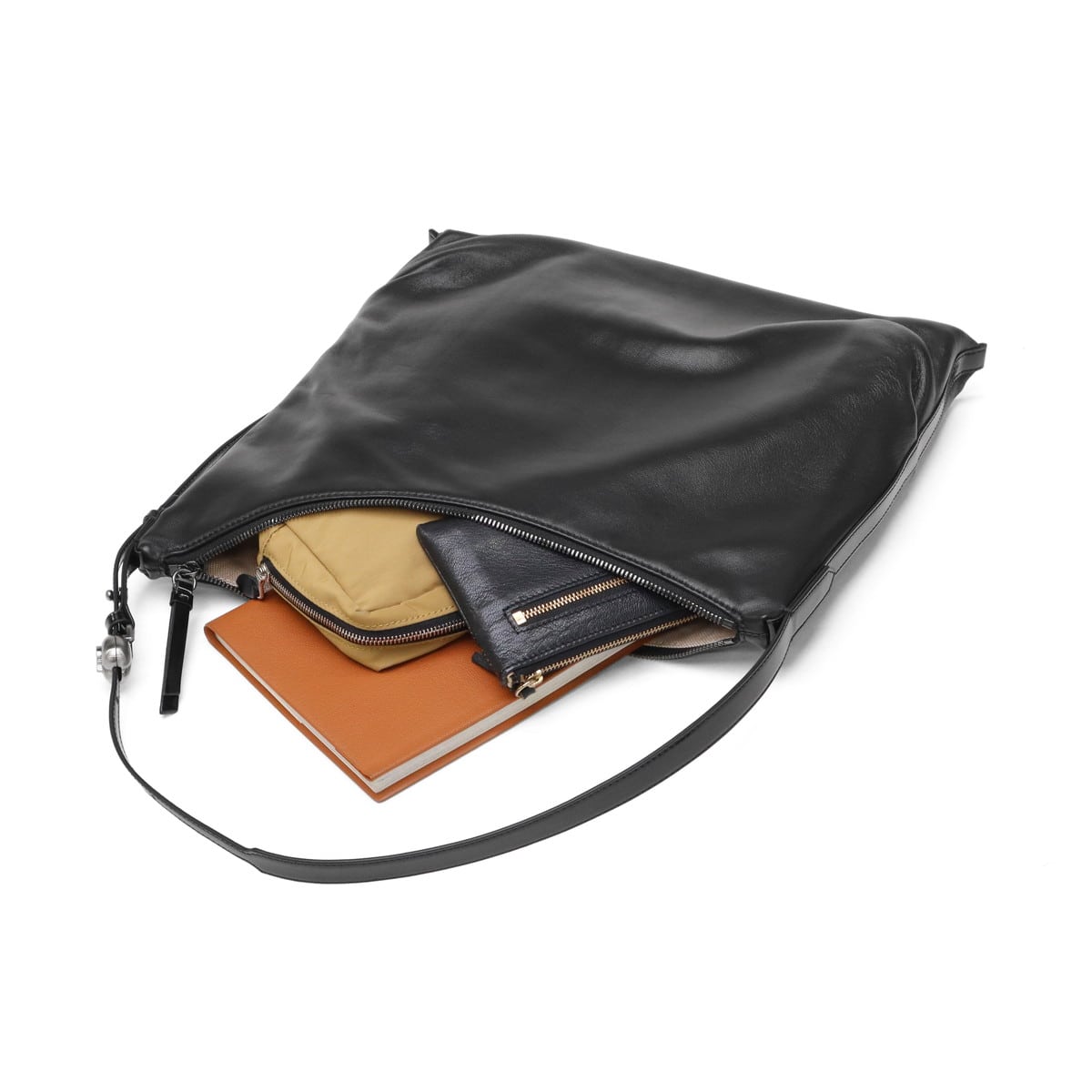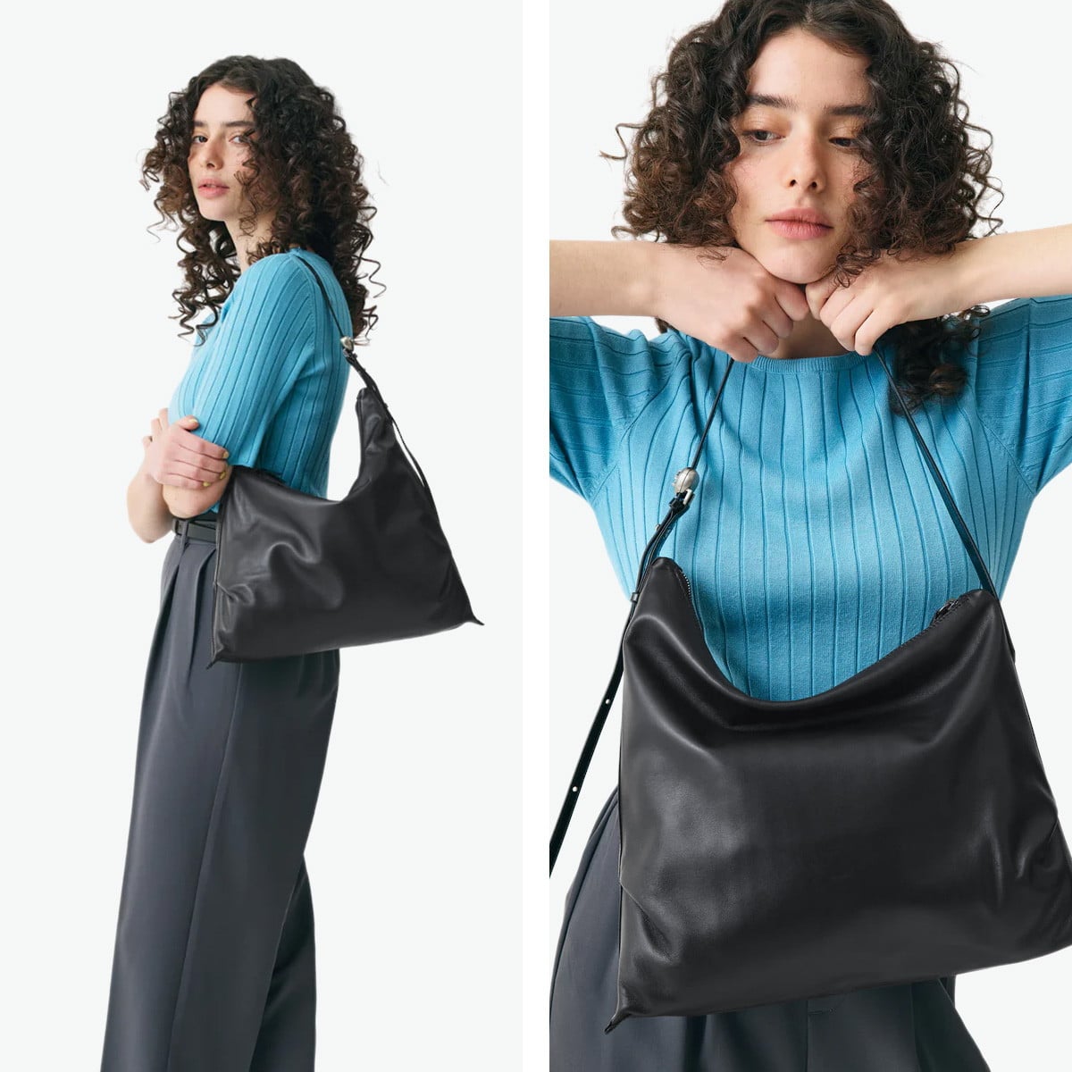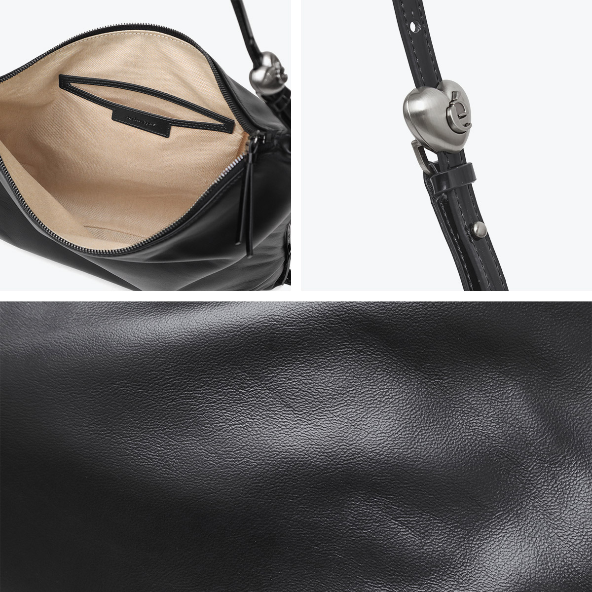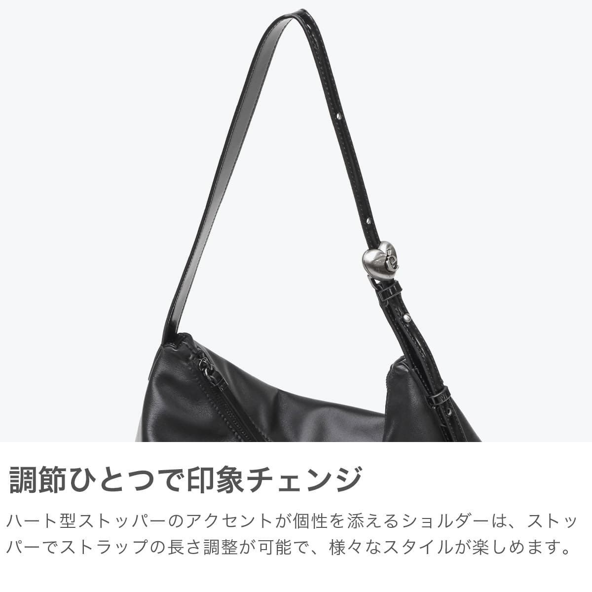 アシンメトリーな形で、持った時に自然な崩れを生み出すワンハンドル仕様。柔らかいラムレザーをたっぷりと使用した、なめらかな触り心地が特徴です。すっきりとしたデザインにハート形のストッパーがアクセント。上品さの中に、さりげなく可愛らしさをあしらった人気アイテムです。