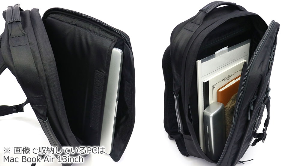 メイン収納はA4サイズ対応となってます。収納部のファスナーが大きく開閉するため視認性に優れ、荷物の出し入れをスムーズに行うことができます。内装のPC収納はベルクロ開閉となっているため、中身のはみ出し防止効果を担い、安全に収納することが可能です。
