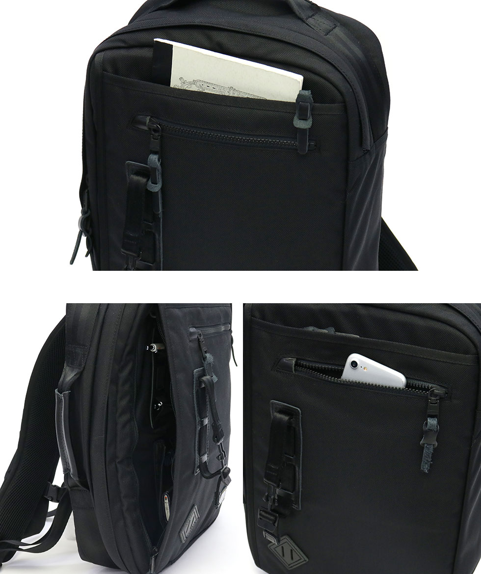 仕様 |[外側] ・ジップポケット(L)×1[ポケット(S)×1、ポケット(XS)×1、ペンホルダー×3 内蔵] ・ジップポケット(L)×1 ・ジップポケット(M)×1 [内側] ・PC収納×1