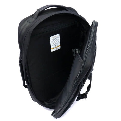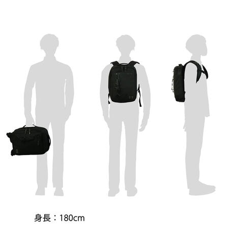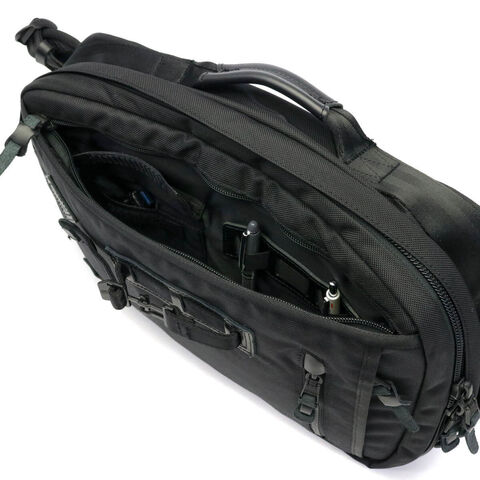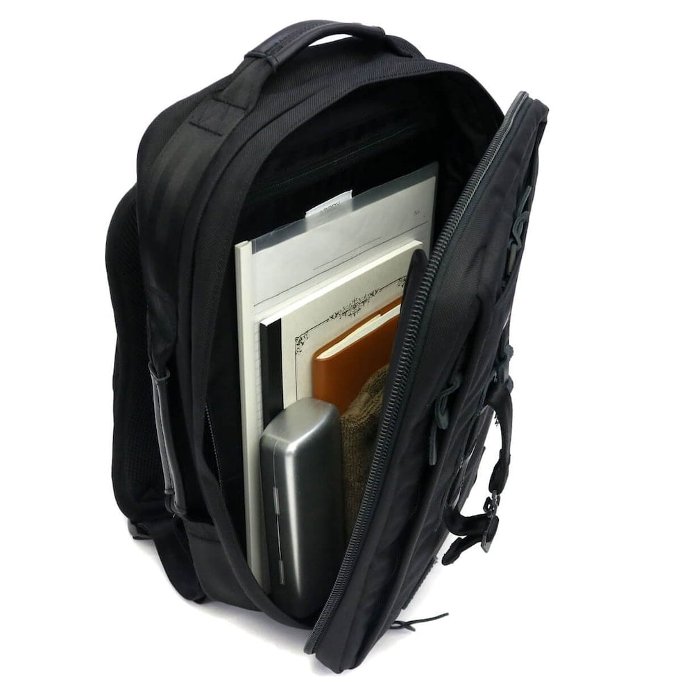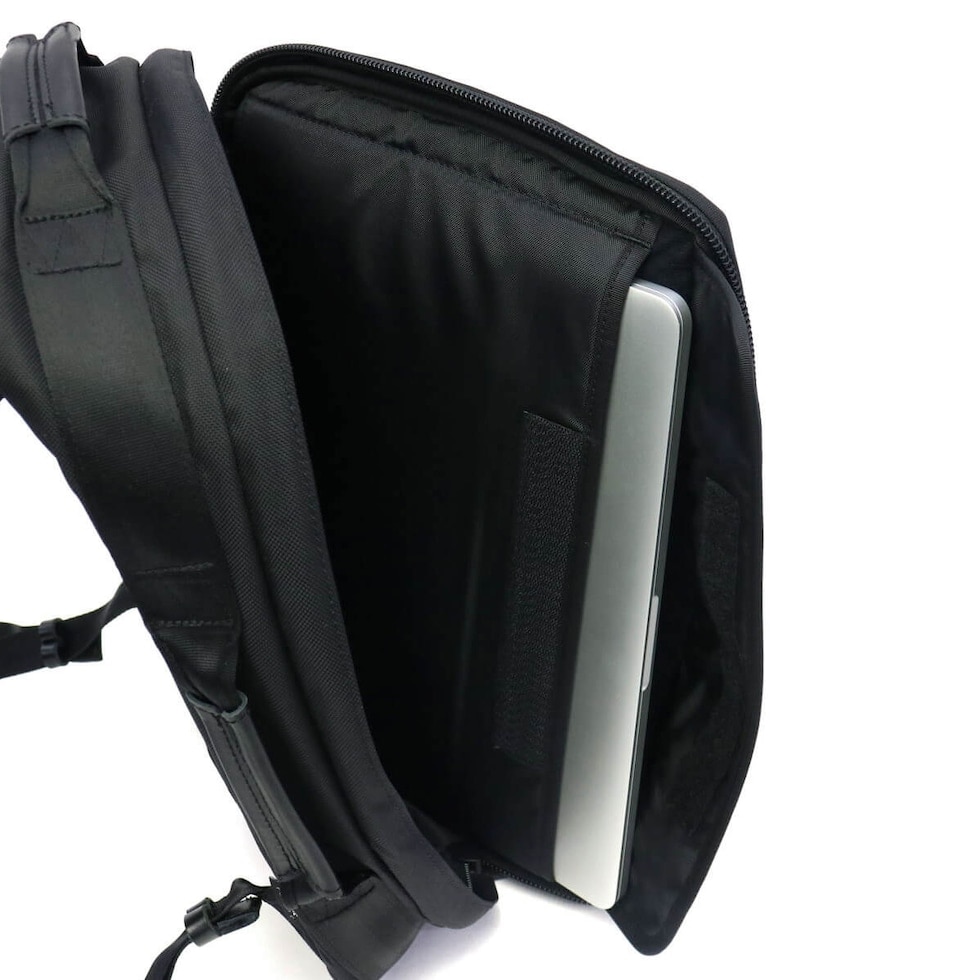 本体にはハンドルが備わっており、背負いだけでなく、手持ちのブリーフケースとしてご使用いただけます。背面のリュックストラップが不要な際にはベルクロで固定することにより、すっきりとしたシルエットにまとめることができます。