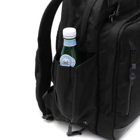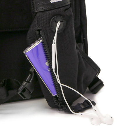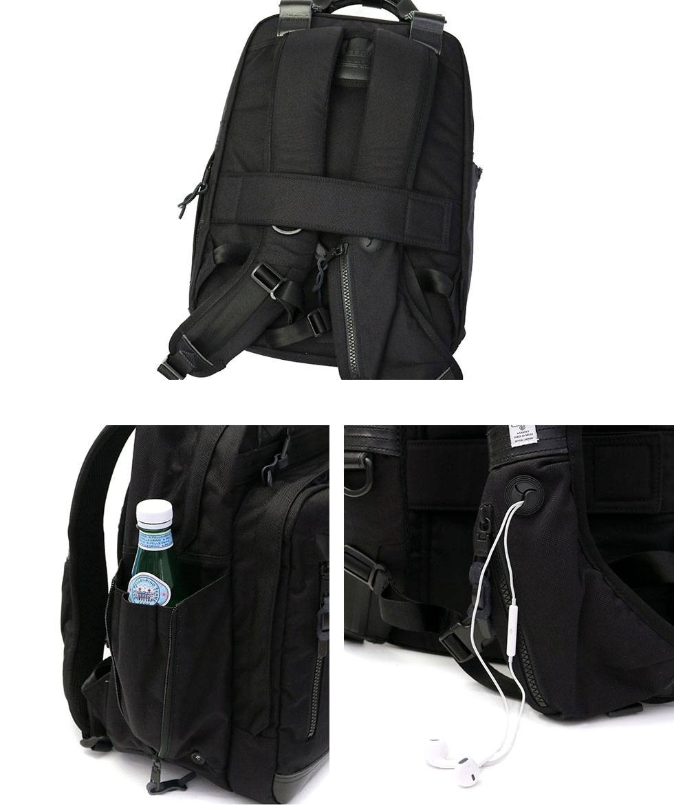本体背面には、リュックストラップをひとつにまとめられるベルトを装備し、手持ちバッグとして使用する際もすっきりとしたシルエットでお使い頂けます。また、イヤホンコードが通せるポケットやペットボトル収納など、使い勝手をよくする機能性が魅力的です。