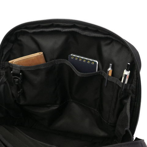 本体は、A4サイズ対応のしっかりとマチ幅が設けられたつくりで、自立するほど安定感があります。フロントのジップポケット内には、12インチまでのPCやタブレットの収納に便利な裏起毛仕様のポケットや、小物類を細かく仕分けられるポケットを備え、充実した収納力となっています。