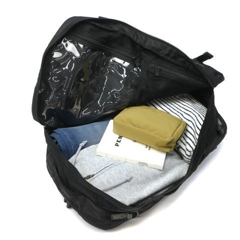 本体はマチ幅と広さを備えた大容量なサイズ感で、1~2泊程度の旅行や出張などで必要な衣類やタオル、A3サイズのアイテムなどがしっかり収まります。大きく開く収納口でパッキングしやすく、内装に設けられたメッシュやクリア仕様のポケット、オーガナイザーポケットなどで小物管理もスマートに行えます。
