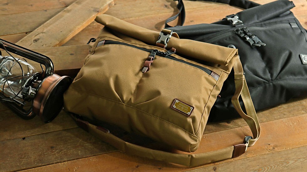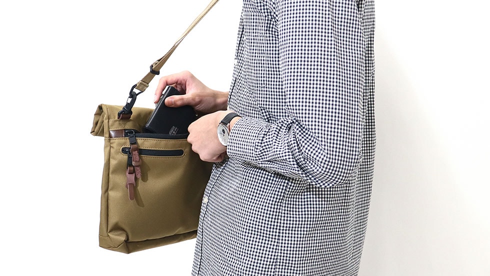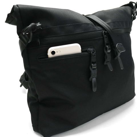 本体素材にはタテ・ヨコに305d の特殊ポリエステル糸を使用したCORDURA 305d fabricを使用し、摩擦・引き裂き・すり切れ等に対する強度を備えたミニショルダーバッグです。ロールトップタイプ仕様で、外側背面のジップからメインルームに直結可能なデザインもポイントになっています。