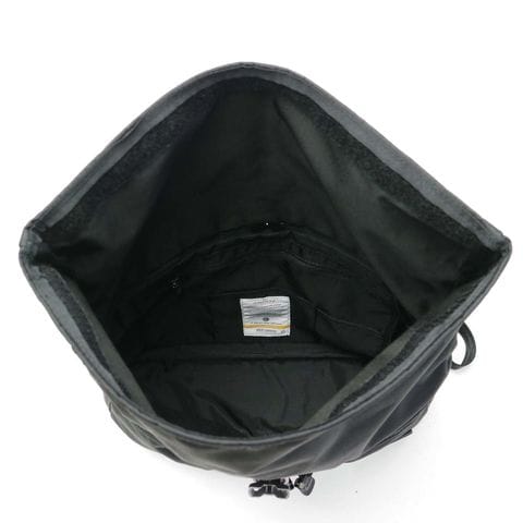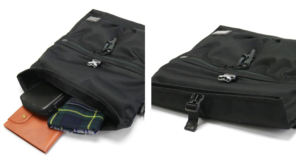 メイン開閉部はベルクロ留めとバックル式の仕様になっています。大切な荷物をしっかりと守る構造になっているので、アクティブなシーンでも安心して行動できます。メインルームは普段のお出掛けにぴったりなサイズ感になっています。