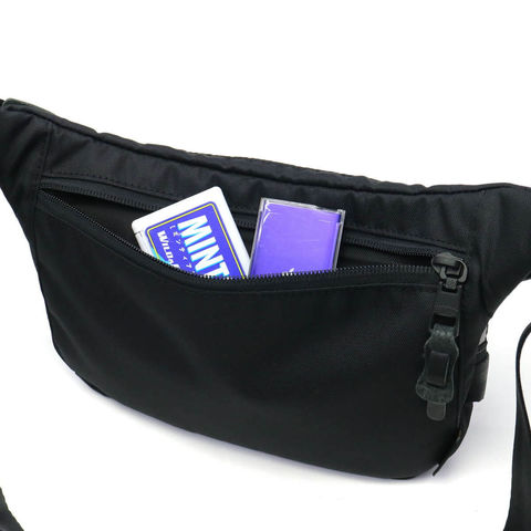 メイン収納はお財布やスマホなどをコンパクトに収納でき、身軽に動けるサイズ感となっています。フロントポケットには水の侵入を防ぐ止水ファスナーを採用。また、フロントポケット内装にはカードポケット収納を設けています。