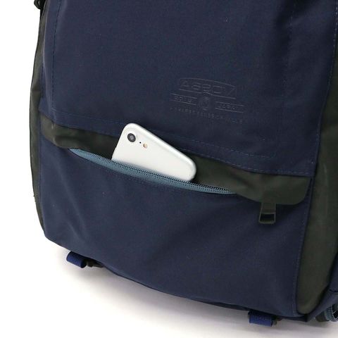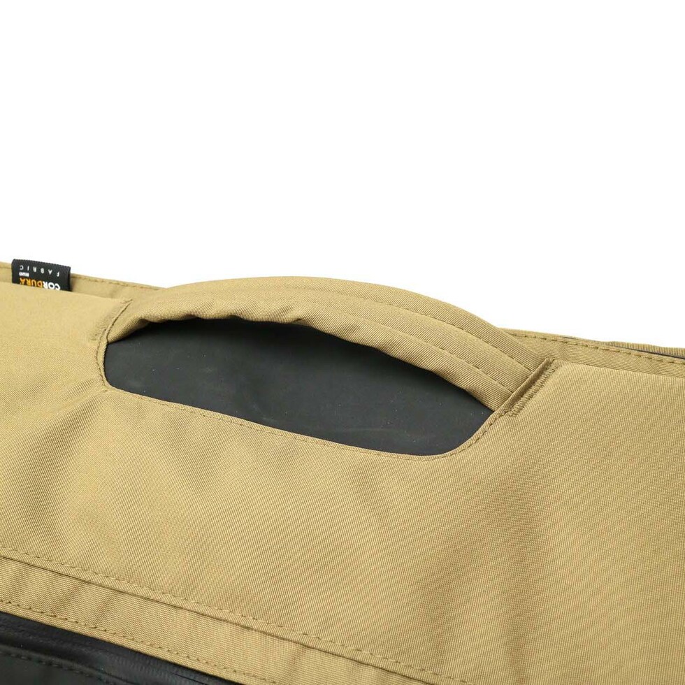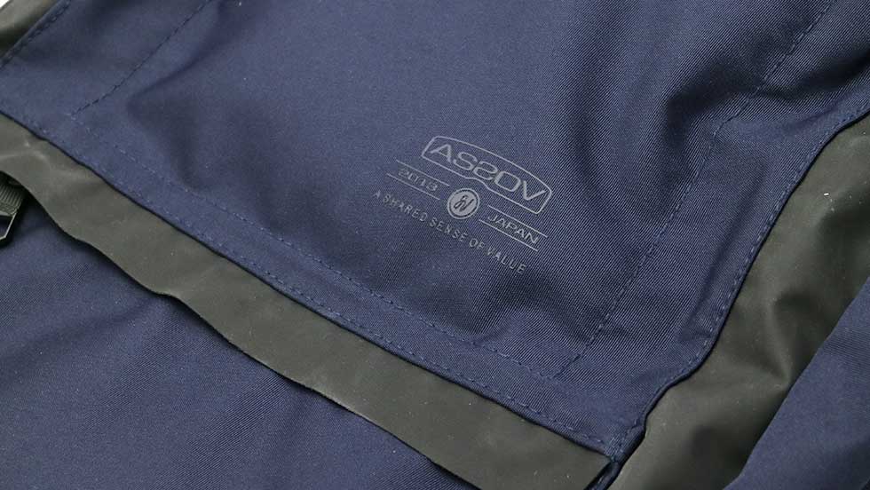 本体素材には、特殊ポリエステル糸のCORDURA 305d fabricを使用し、摩擦・引き裂き・すり切れ等に対する強度を備えています。裏面は「水蒸気を通し、雨風は通さない」耐水圧20000mm以上の透湿防水性素材L-VENT加工(3レイヤー)の素材を使用しています。所々のポケットにシームテープ加工を施し、縫製部分からの水滴の侵入を防ぎます。