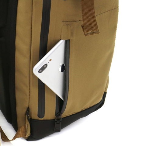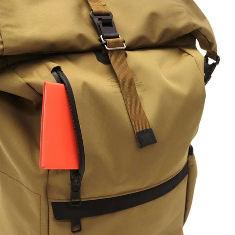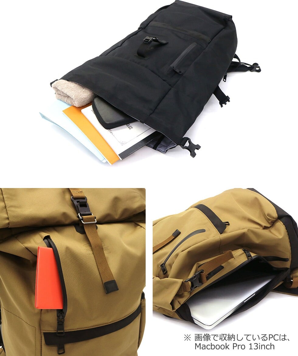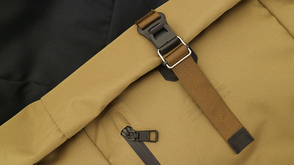 ロールの留め具は、FIDLOCK社のマグネット式のロックを使用し、片手で操作が可能。A4サイズがゆったりしまえるサイズ感で、内装には、クッション性のあるPC収納スペースを装備しています。また、アウトスペースに設けられたジップポケット類は、止水ファスナーが採用され、防水性にも優れたつくりです。
