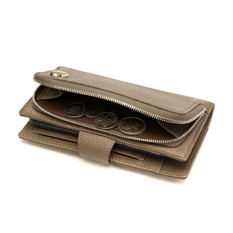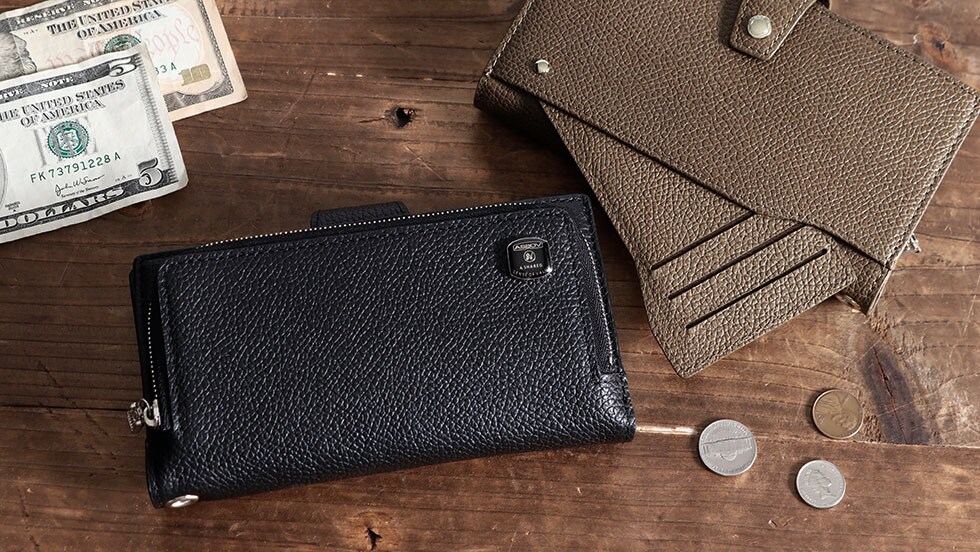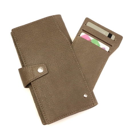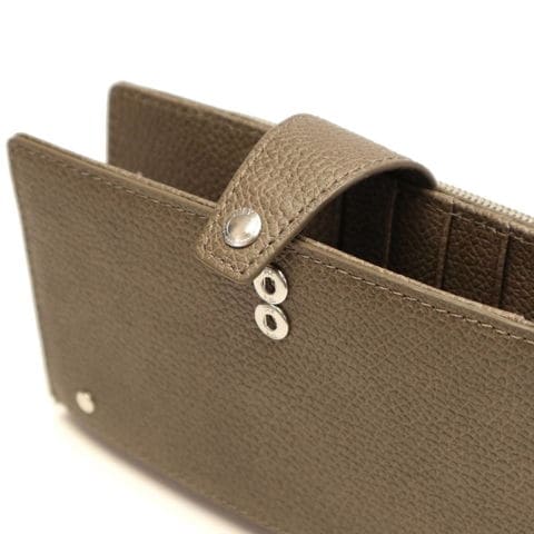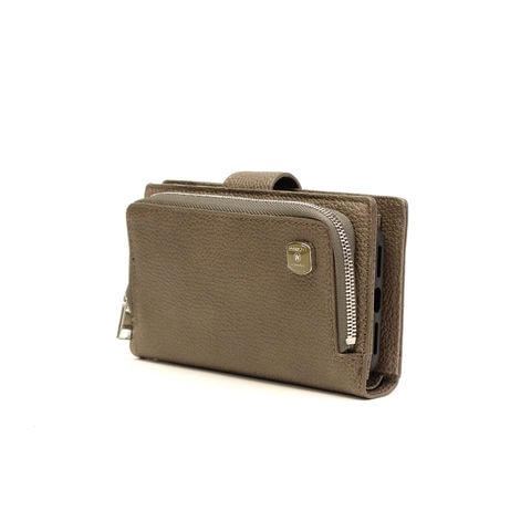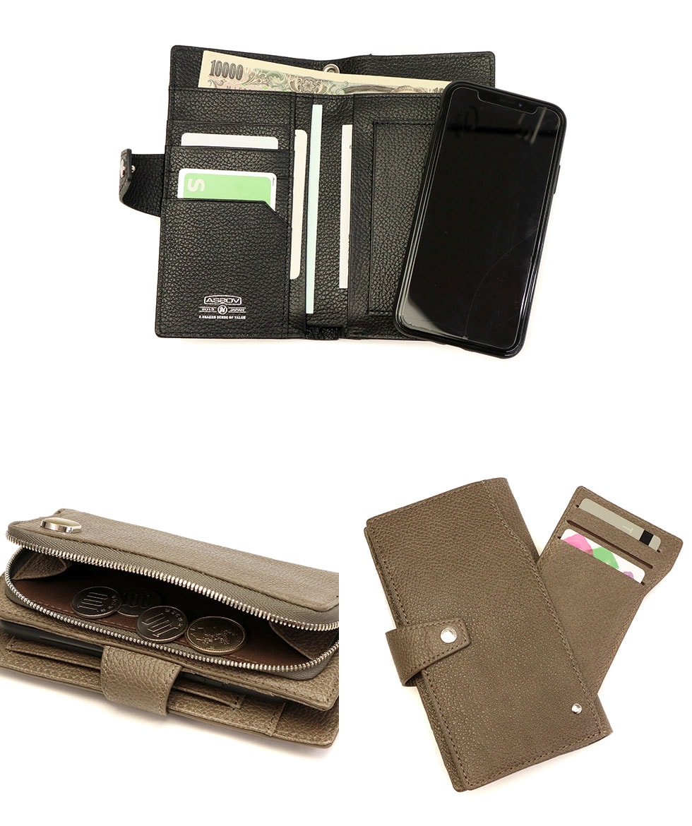 本体はお財布とスマホ、それぞれ単体でもお使いいただけるのが便利。内装には必要十分な紙幣やカードが難なく収まり、また駐車券やレシート類を保管できるポケットも備わっています。さらに独立した小銭入れや外ポケット内にカードケースを取り付けるなど、余分なスペースのないスマートな仕上がりです。