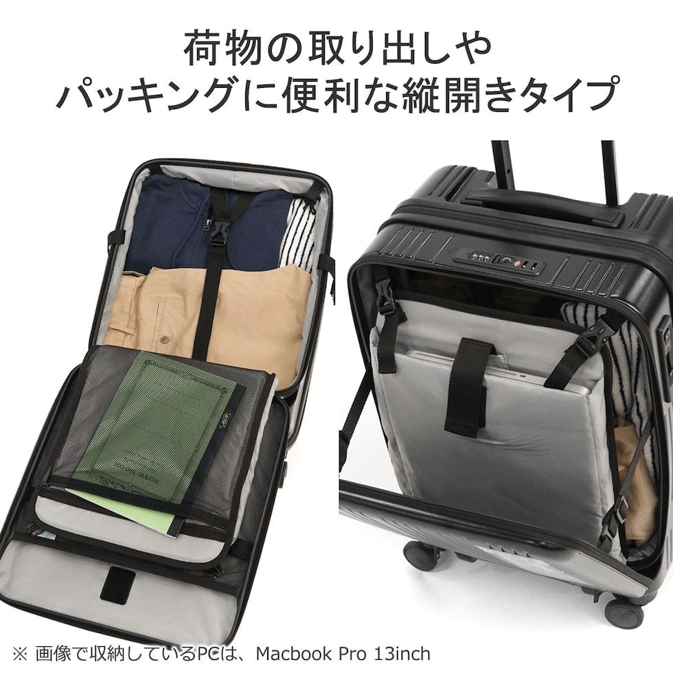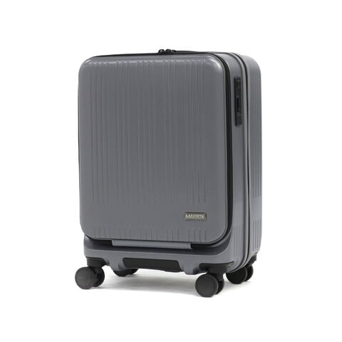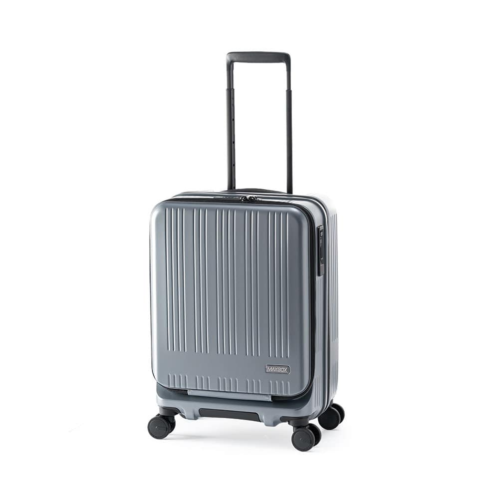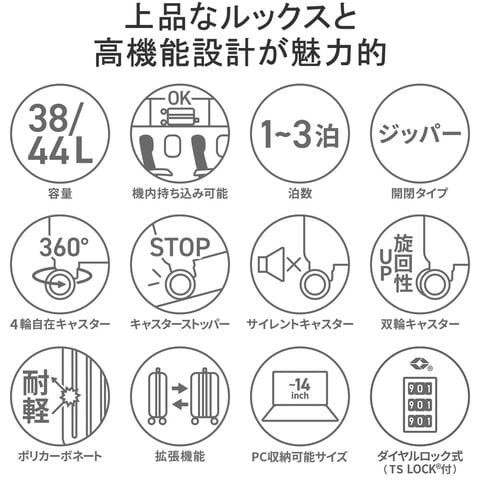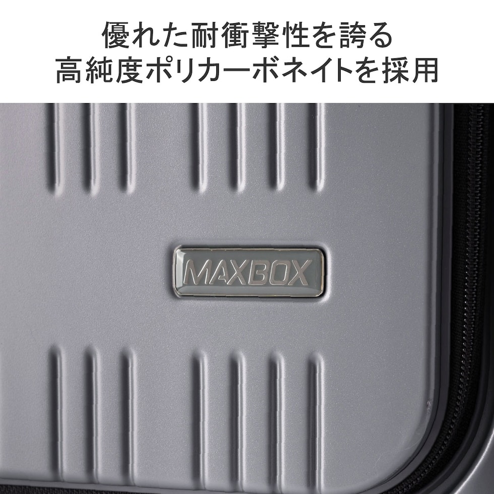 スマートなルックスながら大容量かつ超軽量という、ラゲージに求める全ての条件を満たす『MAXBOX/マックスボックス』シリーズ。こちらは1~3泊程度対応で、機内持ち込み可能なモデルです。ファスナーを開くことで、38Lから最大44Lまで容量の拡張が可能。収納部は縦開きで、サッと広げて荷物を取り出しやすいデザインです。抗菌防臭加工のされた内装には、14インチ対応のPC収納や、クロスベルト収納など、機能性が充実しているのもポイントです。