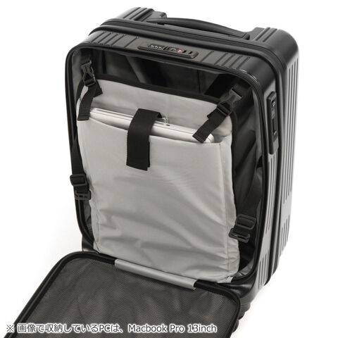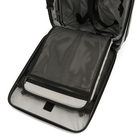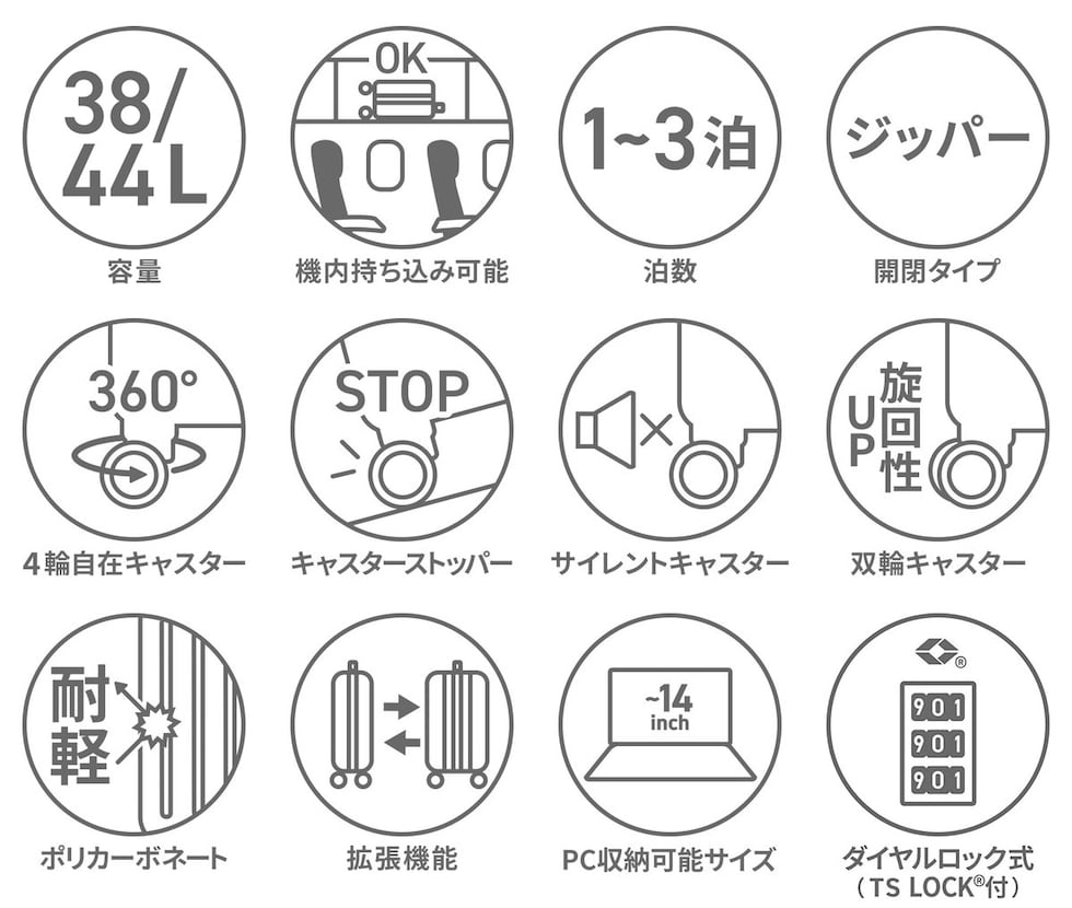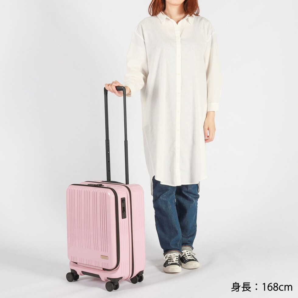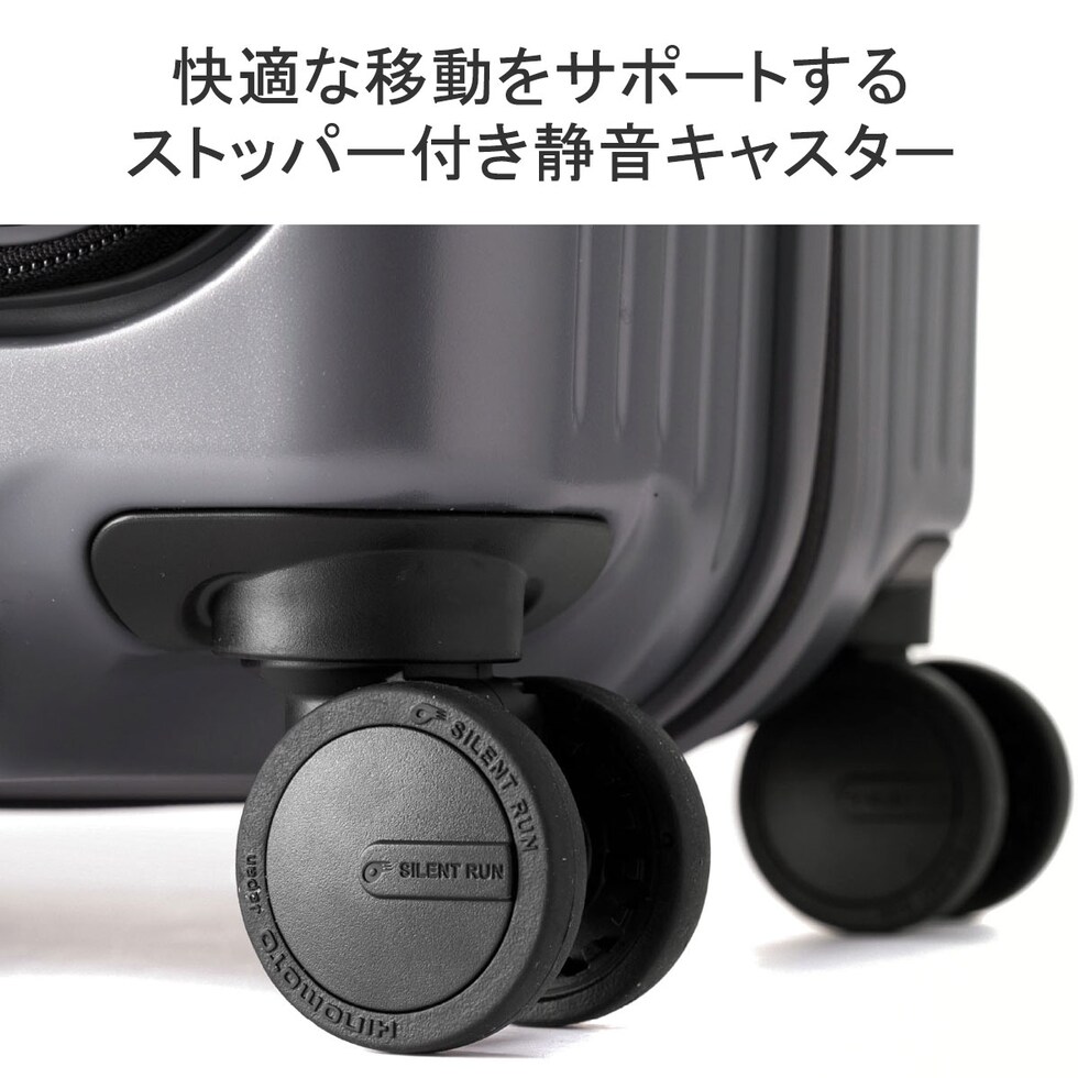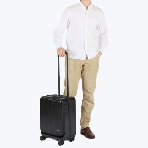 スマートなルックスながら大容量かつ超軽量という、ラゲージに求める全ての条件を満たす『MAXBOX/マックスボックス』シリーズ。こちらは1~3泊程度対応で、機内持ち込み可能なモデルです。ファスナーを開くことで、38Lから最大44Lまで容量の拡張が可能。収納部は縦開きで、サッと広げて荷物を取り出しやすいデザインです。抗菌防臭加工のされた内装には、14インチ対応のPC収納や、クロスベルト収納など、機能性が充実しているのもポイントです。