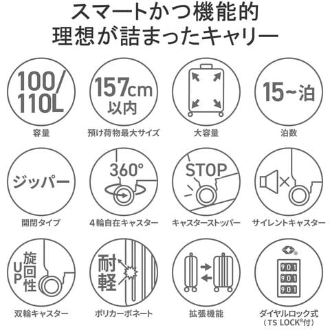 ・こちらの商品はエキスパンダブル機能の拡張時が縦+横+高さの3辺の和が157cmを超えるサイズです。一部航空会社の預け荷物について、超過手荷物料金が発生する場合がございます。航空会社によって規定が異なりますので、詳しくはご購入前にご利用の航空会社へご確認下さい。
