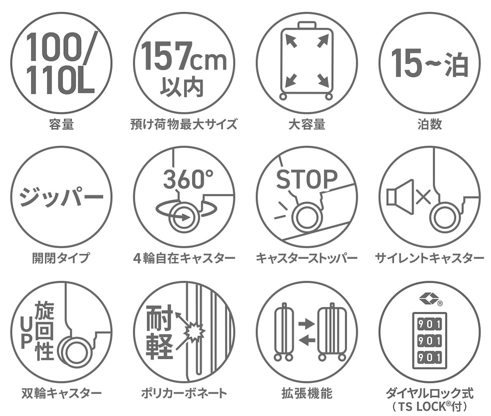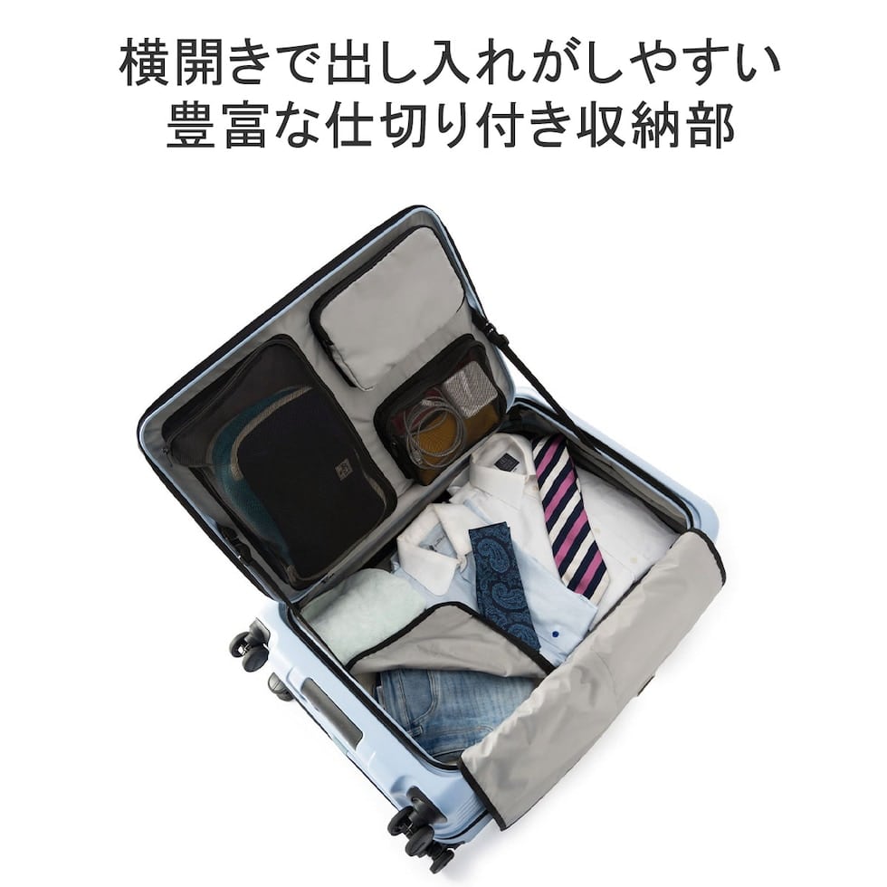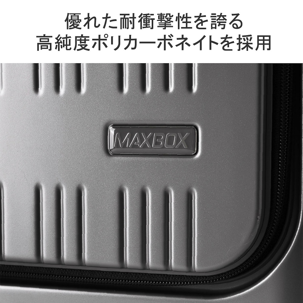 スマートなルックスながら大容量かつ超軽量という、ラゲージに求める全ての条件を満たす『MAXBOX/マックスボックス』シリーズ。2週間程度の長期外泊に最適なこちらのスーツケースは、滞在先での荷物の増減にも対応する拡張機能を搭載し、最大110Lまで拡張が可能です。出し入れに便利な横開きのつくりで、抗菌防臭加工のされた内装には2種類の仕切りを完備。かさばる荷物を綺麗に管理することができます。