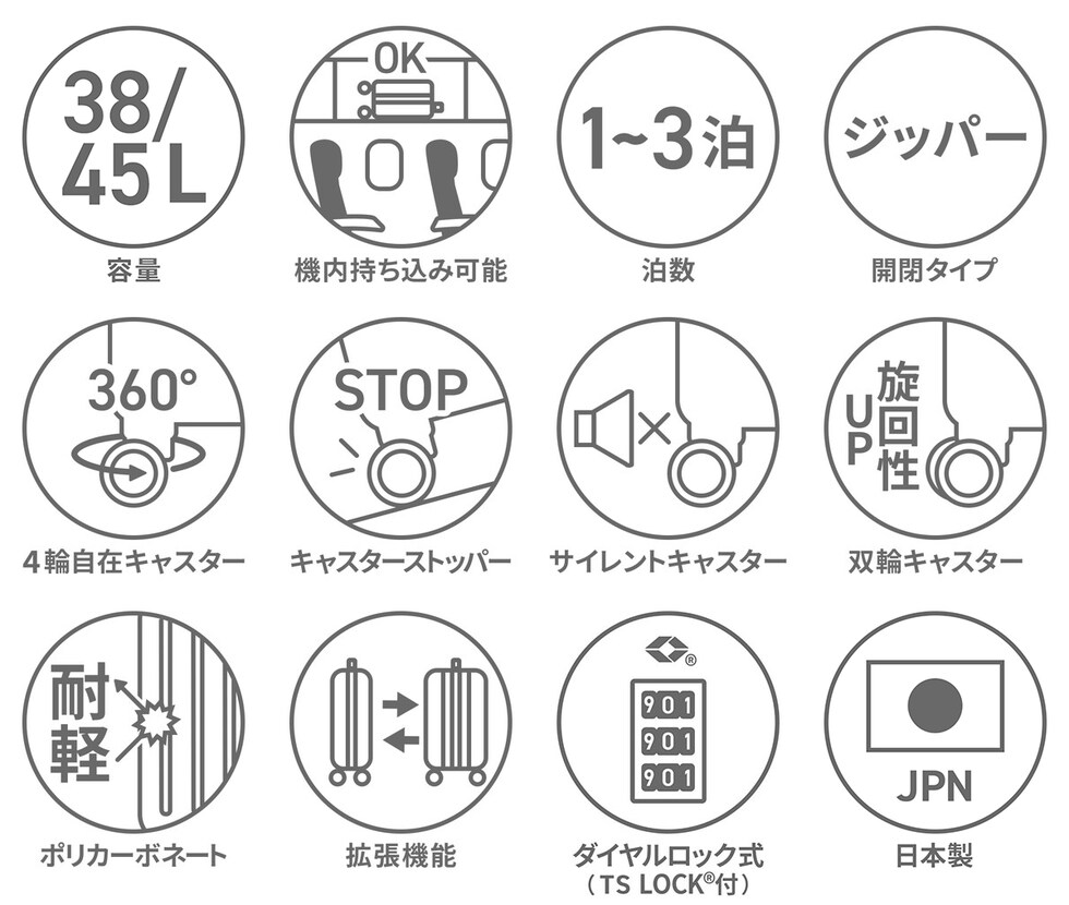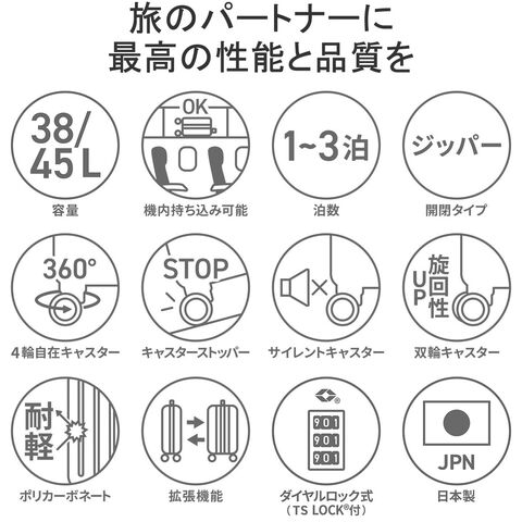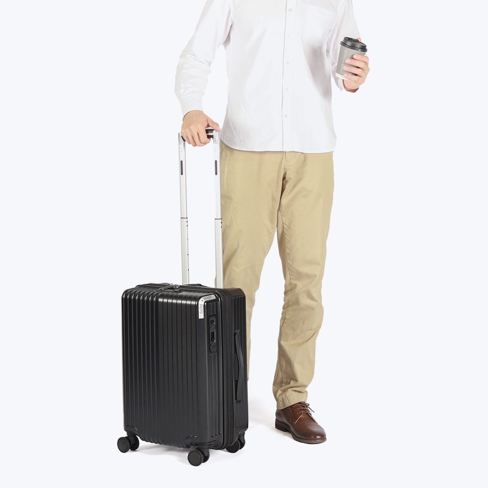 業界最高水準の静音キャスターを搭載した『Solid Knight/ソリッドナイト』シリーズの機内持ち込み可能なスーツケース。日本のメーカーが価値ある製品作りを目指した、高性能で確かな品質が魅力です。抜群の耐摩耗性と静粛性を実現した“極静音キャスター”や、最近やウイルスの増殖を抑制する“抗菌ハンドル”、業界初の“フック付きトローリーバー”など、長く愛用できる実用的なスペックを完備しています。