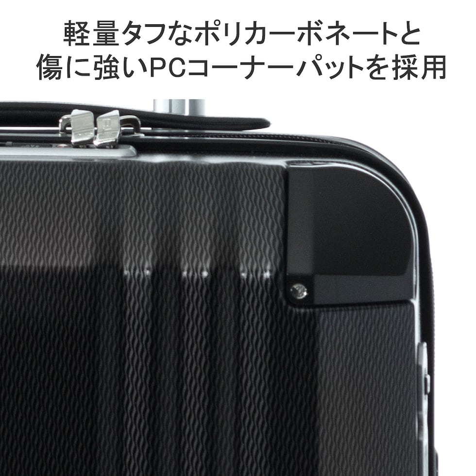 本体のコーナーには、特殊コーティングPCコーナーパットを備えタフな仕上がりに。また、ファスナーには二重コイルを使用したYKK社製の防犯ダブルファスナーを採用しています。大容量の荷物に耐えうる通常の2倍の強度で、コイルのパンクや引き裂きを防ぎます。