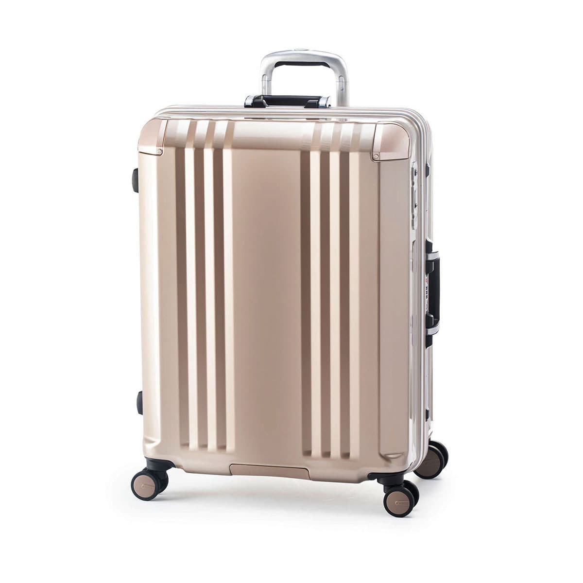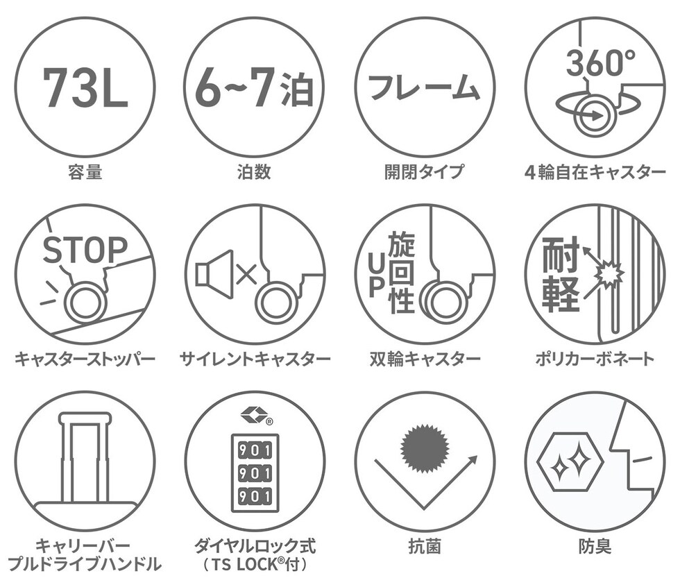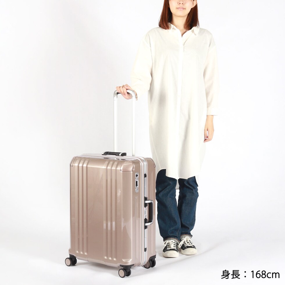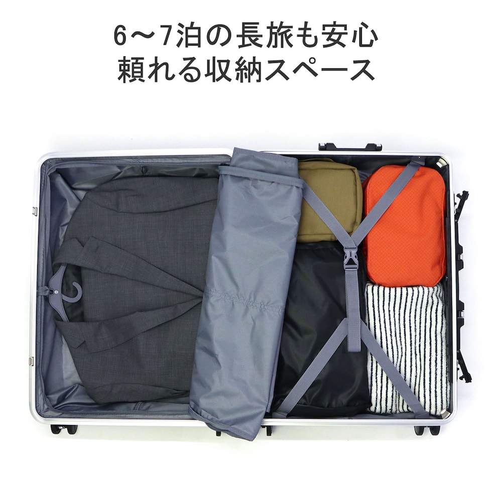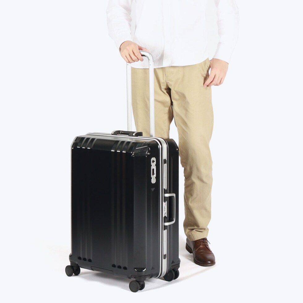 たっぷり入って軽い、が自慢の「デカかる」をさらにハイスペックに進化させた『デカかるEdge』シリーズのフレームタイプ。こちらは、6~7泊の旅行や出張に適したサイズのスーツケースです。しなやかに動くダブルホイールキャスターや、移動時に役立つストッパー付きなど、必要な機能が充実。本体と同色でドレスアップされた特殊コーティングPCコーナーパットを備えることで、傷や衝撃に強いタフな仕上がりとなっております。