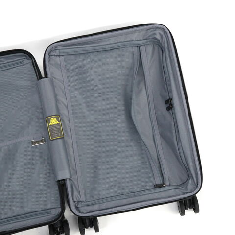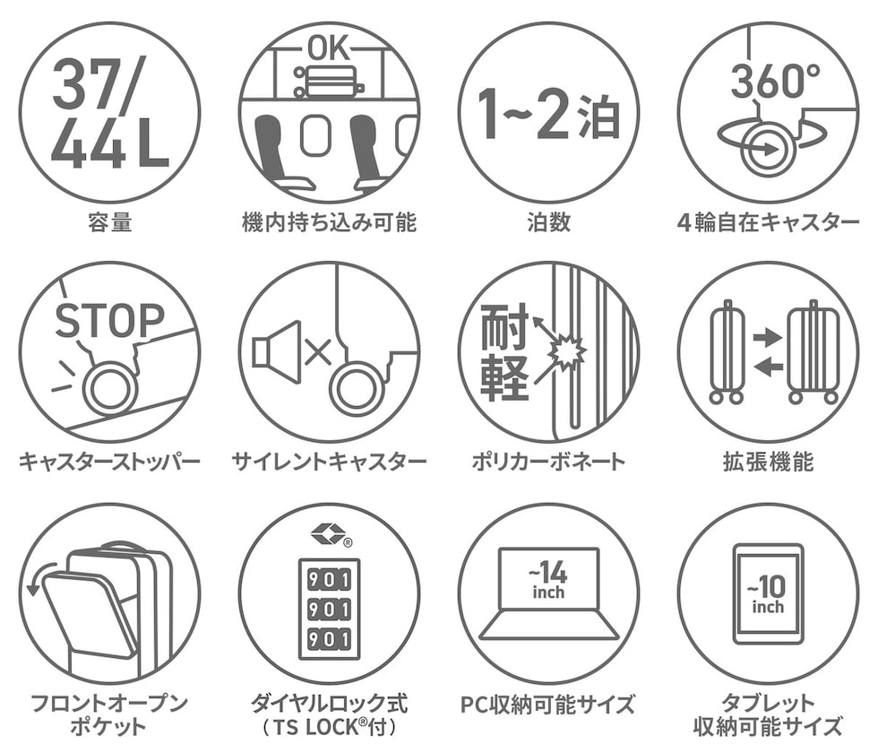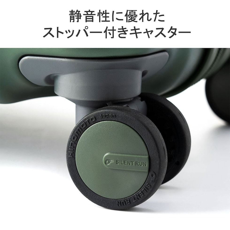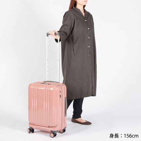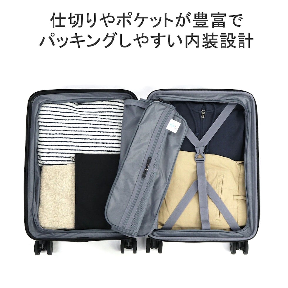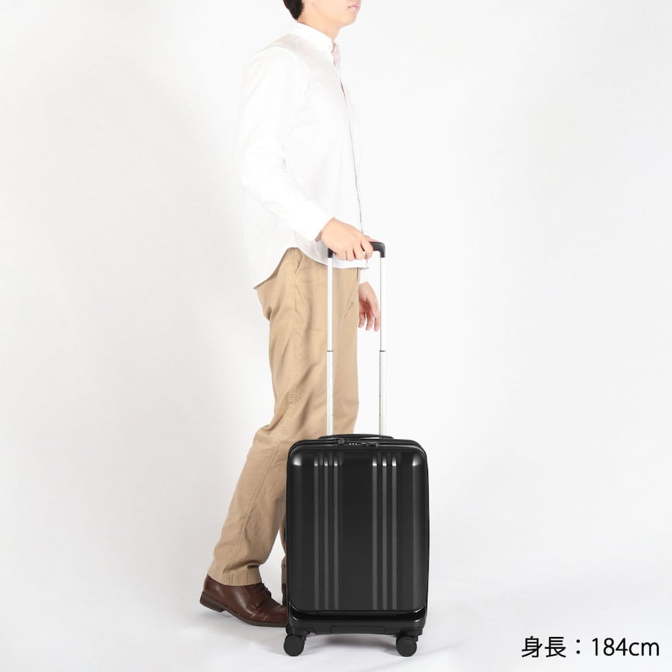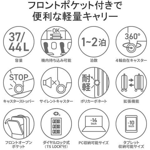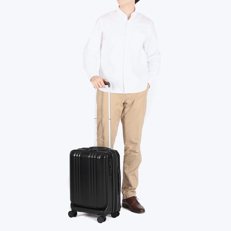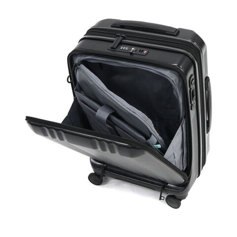たっぷり入って軽い、が自慢の「デカかるEdge」のフロントオープンモデル。こちらは、1~3泊の旅行に最適の、機内持ち込み可能なスーツケースです。容量はサイドのファスナーを開くことで、37Lから最大44Lに拡張することが可能になっています。また、キャスターストッパー付きで、移動時の不意な走行を防ぐストレスフリーな設計もポイント。