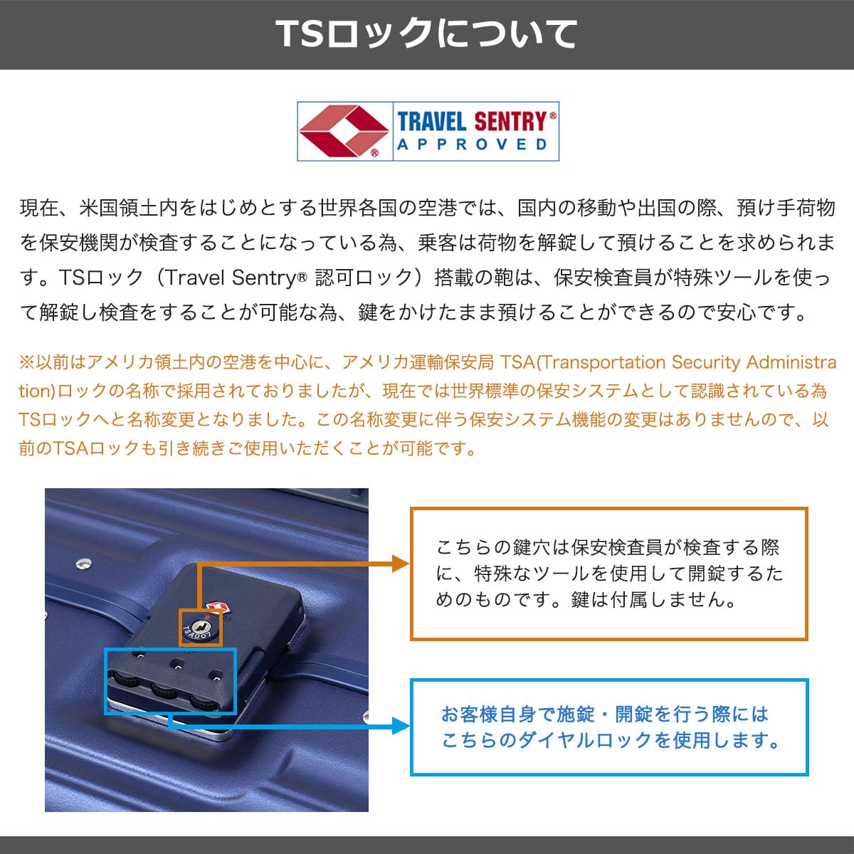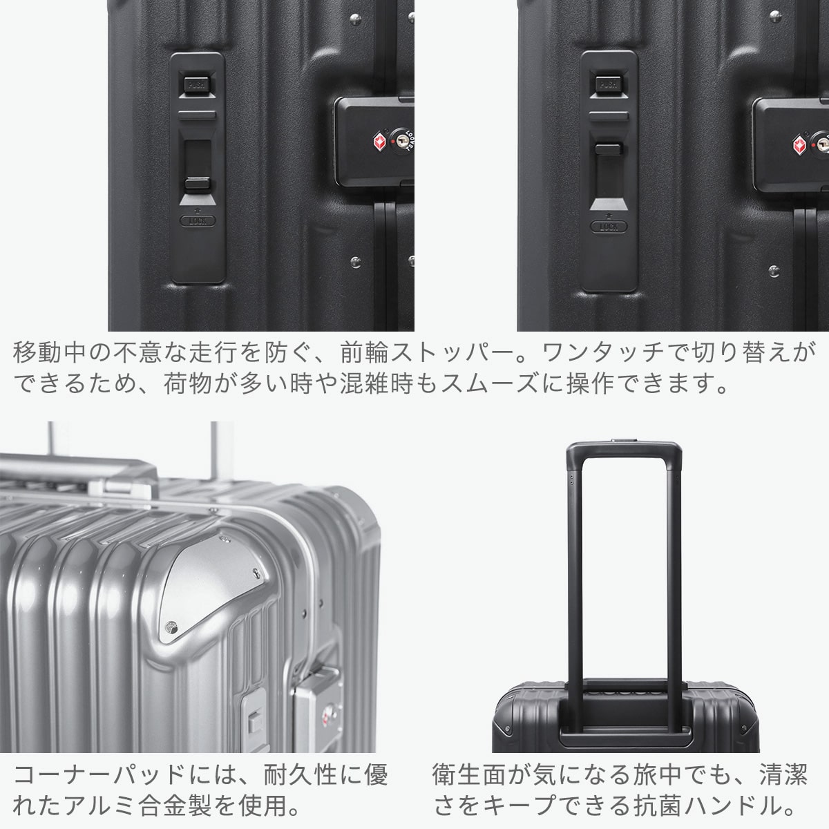 スタイリッシュなデザインが魅力のスーツケースです。こちらは、70L容量で6泊~7泊の旅行や出張に最適です。静音ダブルキャスターと前輪ストッパーで移動もスムーズ。ボトムハンドルで持ち上げやすく、抗菌ハンドルや内装防水ポケットなど機能も充実。100%ポリカーボネート製のフレームタイプで高い耐久性を誇り、ラッチ型TSロック付きで安心です。