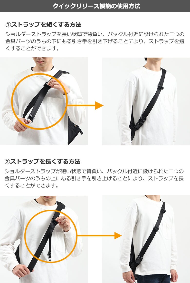 仕様 |[外側] ・ジップポケット(L)×1 ・ジップポケット(L)×1[クリアポケット(S)×1、ポケット(S)×1、ポケット(XS)×3、ポケット(XXS)×1、ペンホルダー×1、フック×1 内蔵] [内側] ・PC収納×1 ・ジップポケット(L)×1 ・ジップポケット(M)×1 ・ポケット(S)×3 [付属品] ・ショルダーストラップ×1