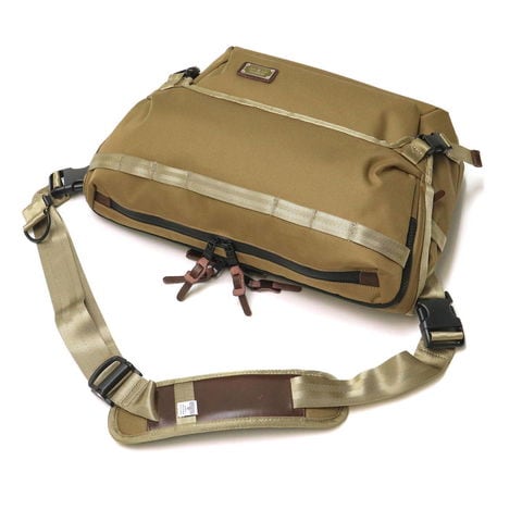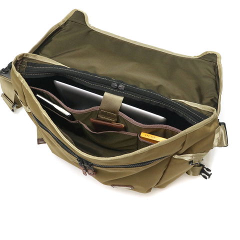 控え目な光沢感と、カジュアルなシルエットになる柔らかさが特徴のオリジナル素材を使用したシリーズ『CORDURA DOBBY 305D』。こちらは真鍮プレートがアクセントになったメッセンジャーバッグです。背面やショルダーパッド等にはしっかりとしたクッション材を施すなど、機能面も充実したアイテムです。