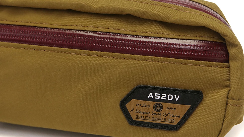 耐水圧10.000ミリ以上の表地を使ったウォータープルーフのペンケース。止水ファスナーとの組み合わせがAS2OVらしい特徴的なカラーリングで、文具はもちろんのこと、キャンプギアや日用品を入れるのにも最適です。