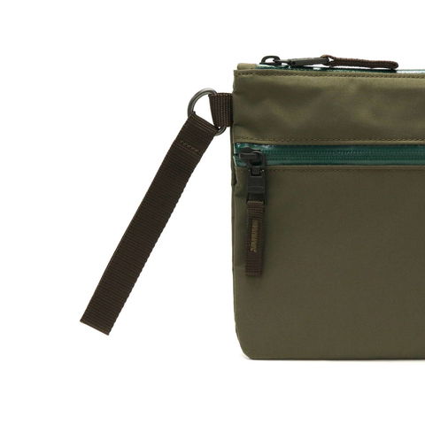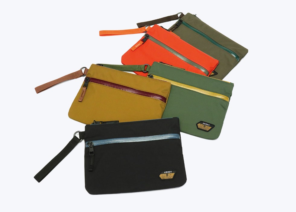 耐水圧10.000ミリ以上の表地を使ったウォータープルーフのポーチ。止水ファスナーとの組み合わせがAS2OVらしい特徴的なカラーリングで、キャンプギアや日用品を入れるのにも最適です。