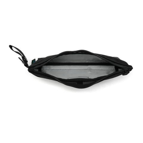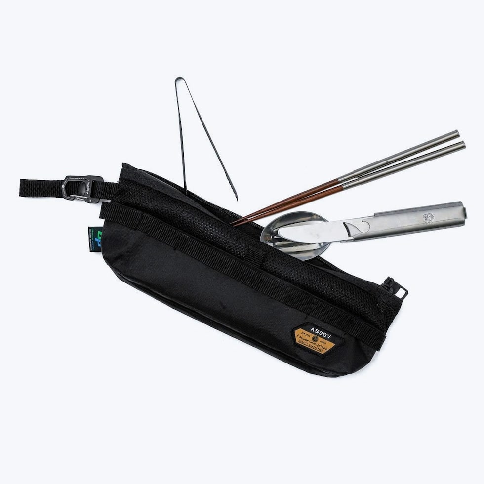 強度・軽さ・防水性を兼ねた「X-PAC」を採用した、カトラリーケース。一部素材をメッシュにすることで、しっかりと通気性を確保。フロントポケットには細かなツールを収納するのにおすすめです。本体サイドに装備したループとカラビナで、バッグにはもちろんポールなどのキャンプギアにも取り付けが可能です。