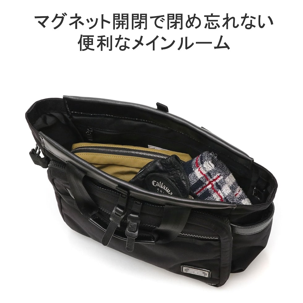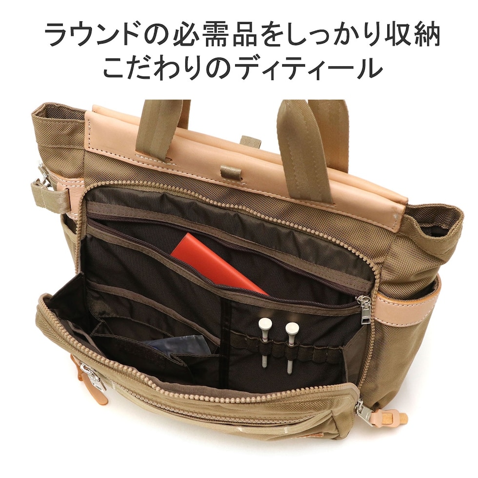 ライトな質感のバリスティックナイロンと上質な革が印象的な『AS2OV GOLF SERIES』のトートバッグ。ハンドルの片側がバックル仕様になっておりラウンド中にカートなどに引っ掛けることもできます。開け口部分のレザーパーツにはマグネットを採用することで、バッグの閉め忘れ防止になり、ゴルフに集中できる便利なつくり。また、複数のティーホルダーや、内側にはクリアポケット、背面にはスマホ用ポケットを配置するなどこだわりの機能満載。豊富な収納と新しい工夫が施され、ゴルフ場を超えて毎日の生活に持ち出したくなってしまうそんなアイテムとなっています。