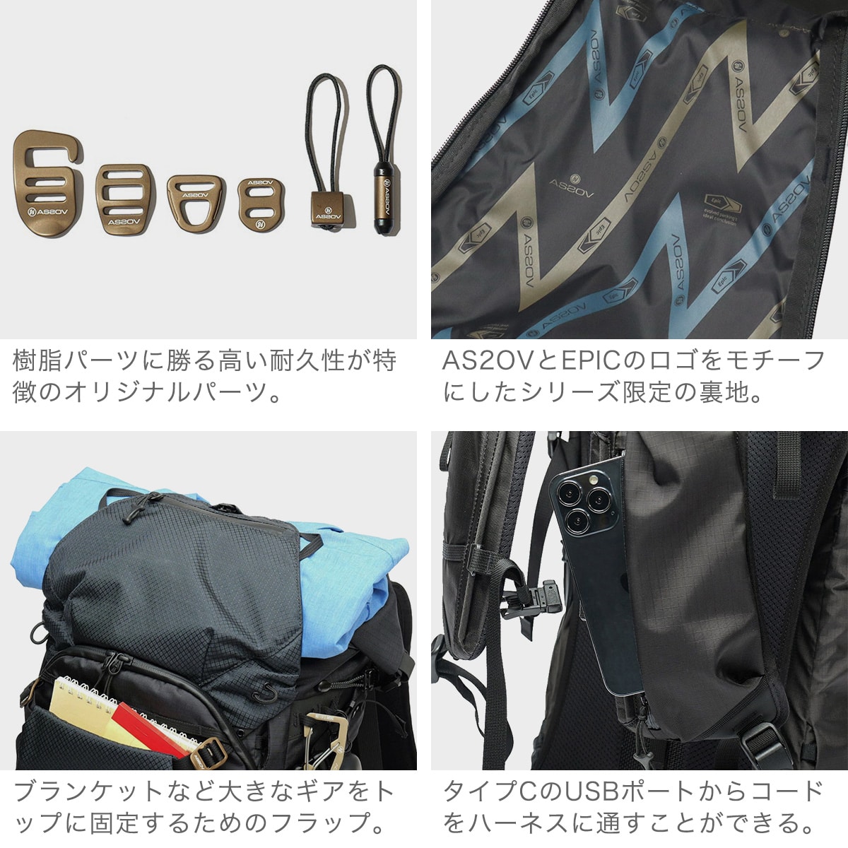 トレッキングやキャンプ、旅行など、あらゆるアクティブシーンに対応する『EPIC SERIES』。メインのバックパックにサコッシュやサイドポーチを自由に組み合わせて、自分だけのスタイルにカスタマイズできるパッキングシリーズです。EPIC BACKPACKの機能美はそのままに、日常使いにちょうどいいSサイズが登場。必要な機能を厳選し、より軽快でコンパクトにアップデートされた、"ちょうどいい"サイズ感のバックパックです。