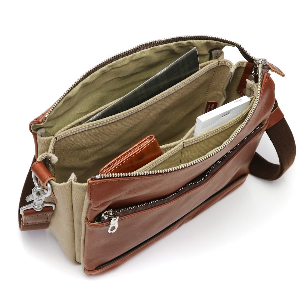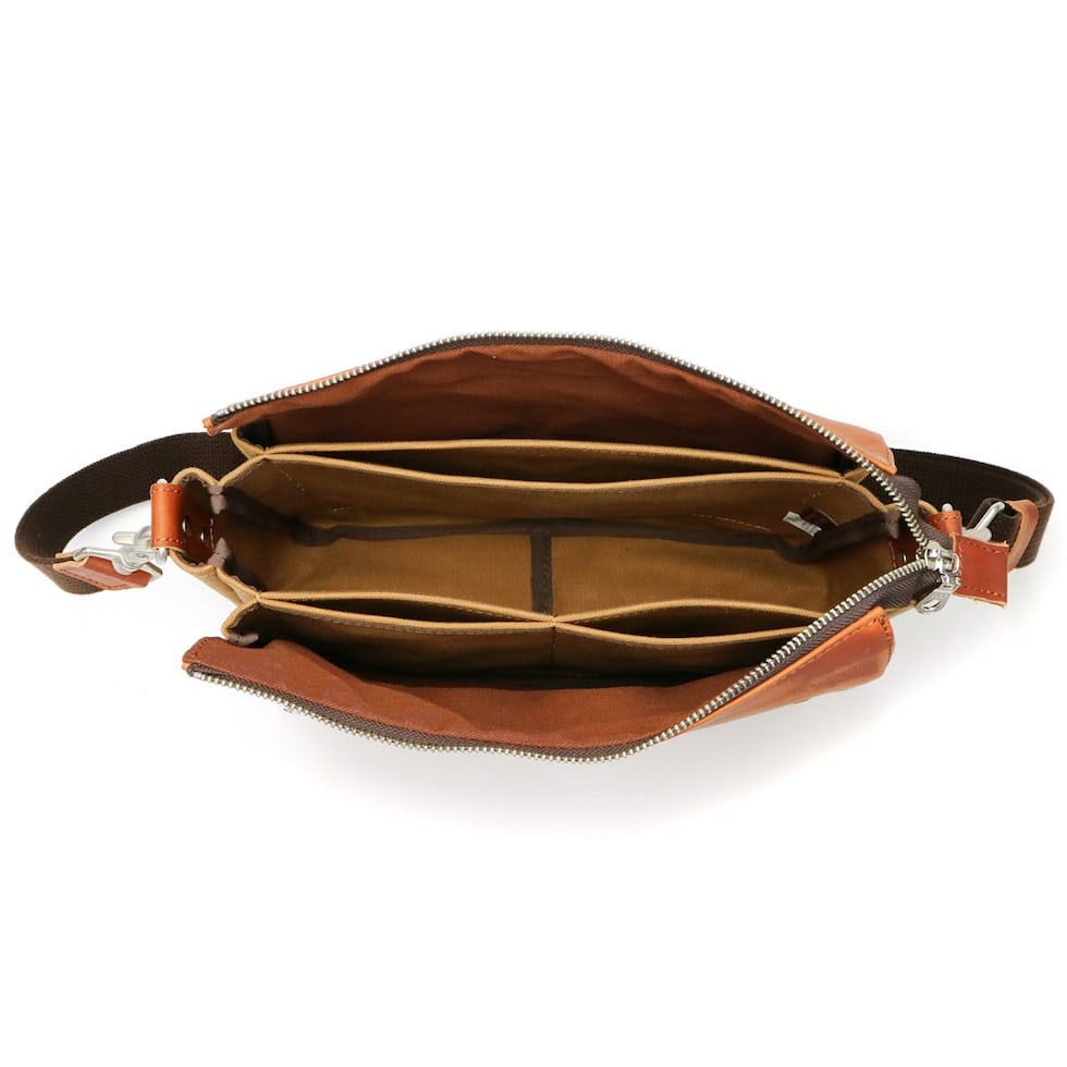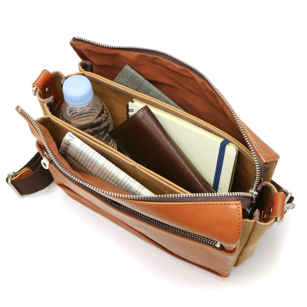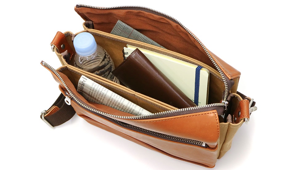 収納スペースは三層構造になっており、荷物をすっきりと整理できるのがポイントです。財布や手帳、ペットボトルなども収納可能なサイズ感で、仕切り部分には小物類の収納に便利なオープンポケットも備えられています。
