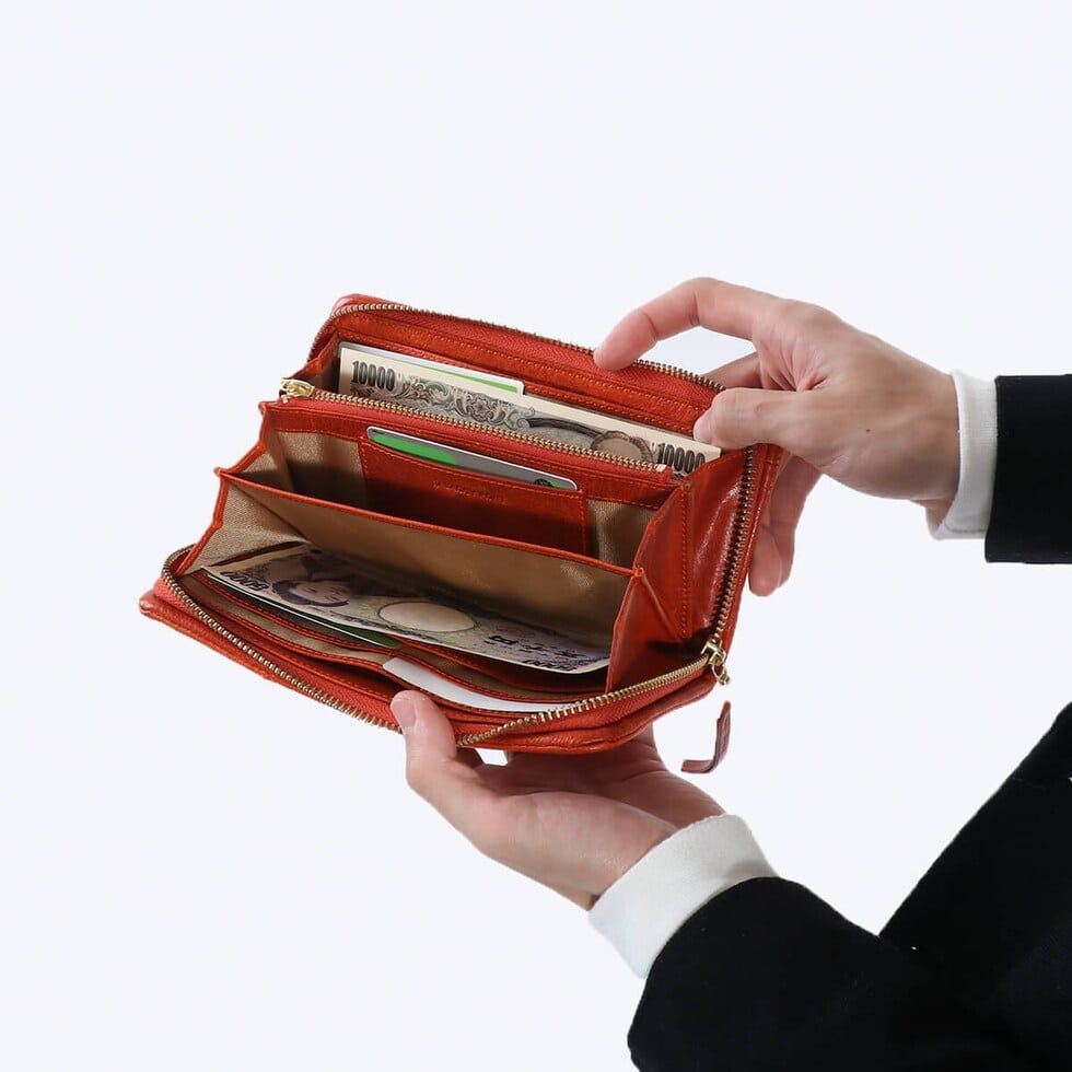 内部にはカードポケットを9ヵ所、領収書やレシートの管理に便利なポケットを3ヵ所装備。多くなりがちなカード類の管理がしやすく、お財布のシルエットをスマートにキープすることが可能です。