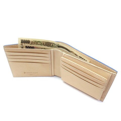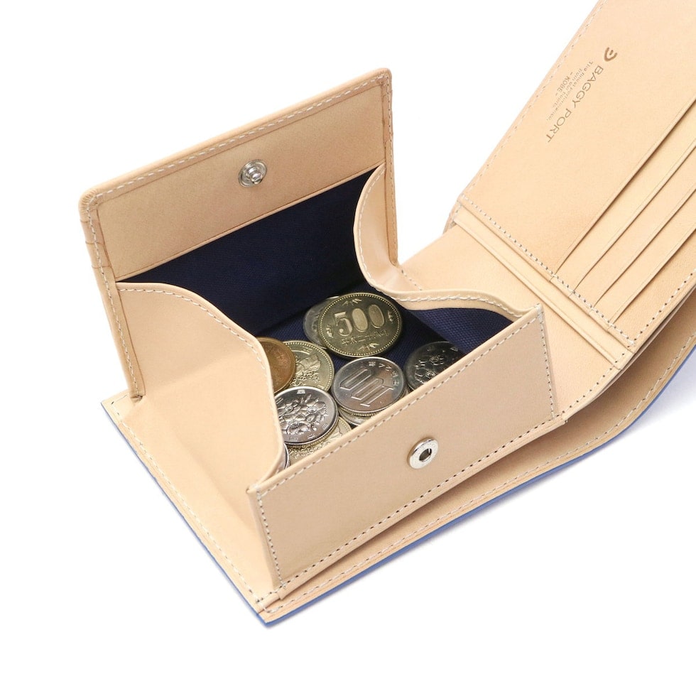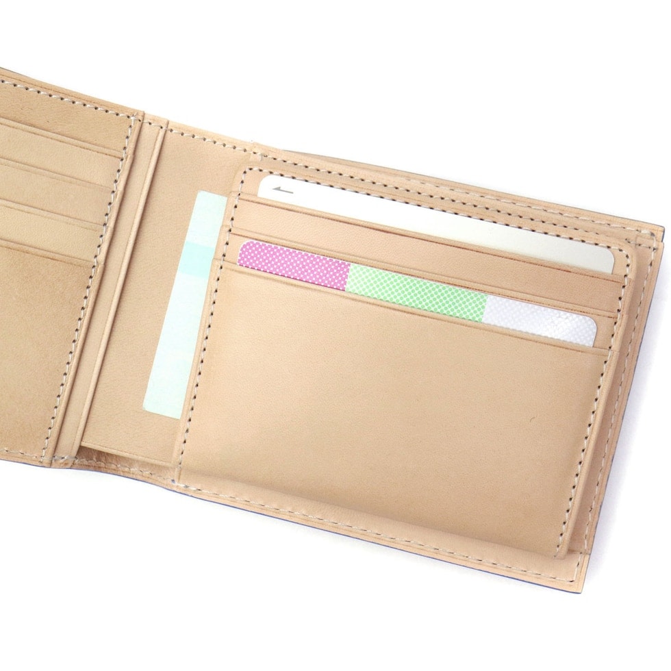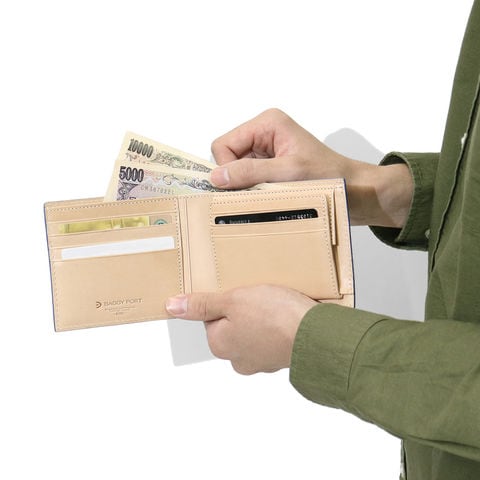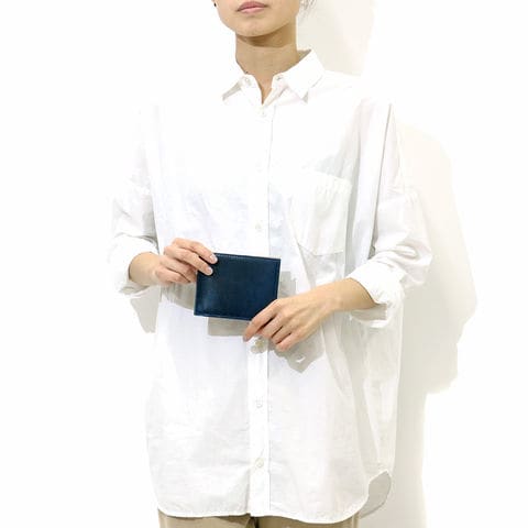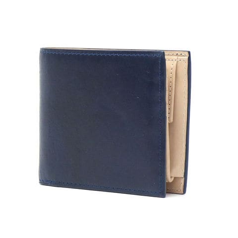「BAGGY PORT」から誕生した「KOI/コーアイ」。こちらは伝統的な藍染めを革に落とし込み、味わいのある「藍染めレザーシリーズ」の二つ折り財布です。本体はレザーを引き立たせるシンプルなルックスで、年齢問わず幅広くお使いいただける仕上がりになっています。