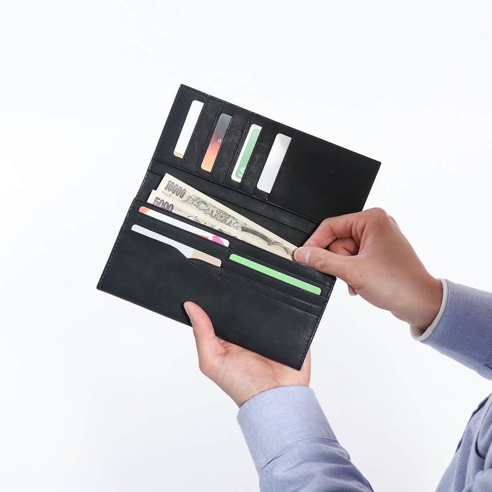 札入れはシンプルに1カ所にまとめられ、マチもあるのでお札の出し入れに便利です。また計13カ所に設けられたカードポケットは、種別ごとに管理しやすく使いたいカードがどこにあるのか見つけやすい設計です。
