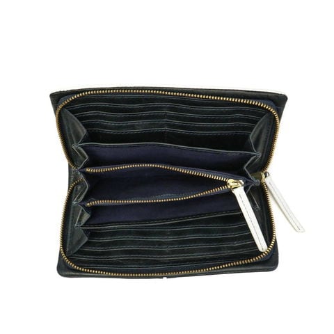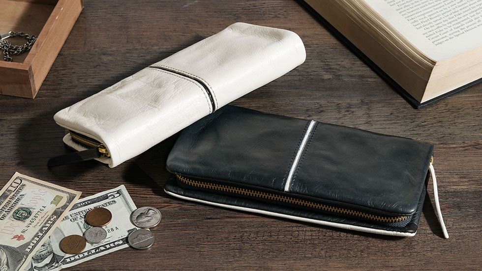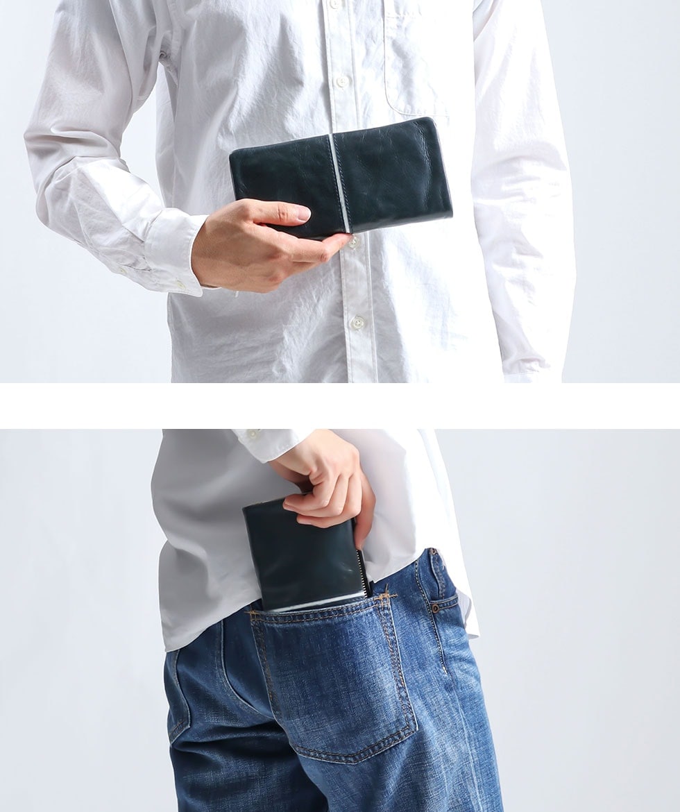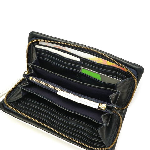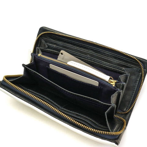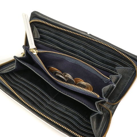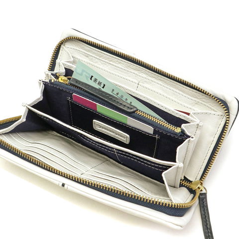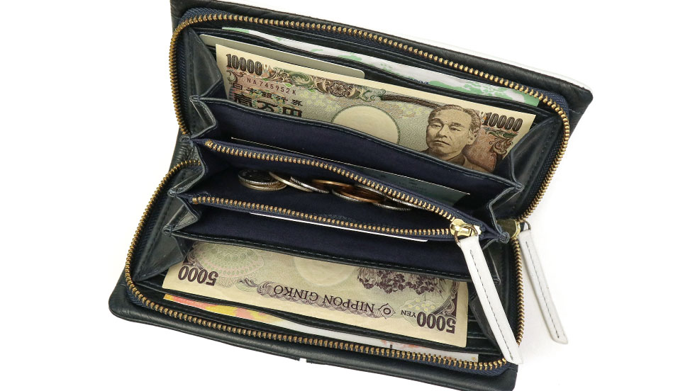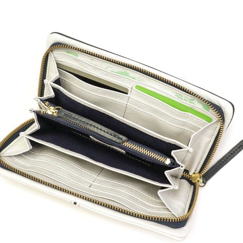 収納部は充実のカードポケットと複数の札入れ、小銭入れを備えた大容量タイプ。収納口が大きく開き、たくさん収納しても中身を見やすく取り出しやすいつくりとなっています。また、ジップの引手が細長く引きやすいため、スムーズに開閉できる点もポイントの一つです。