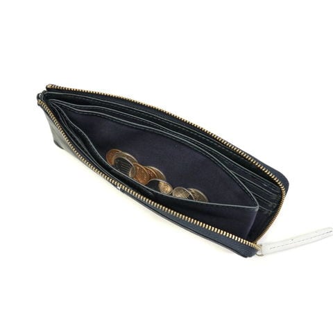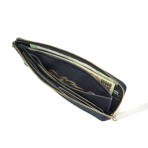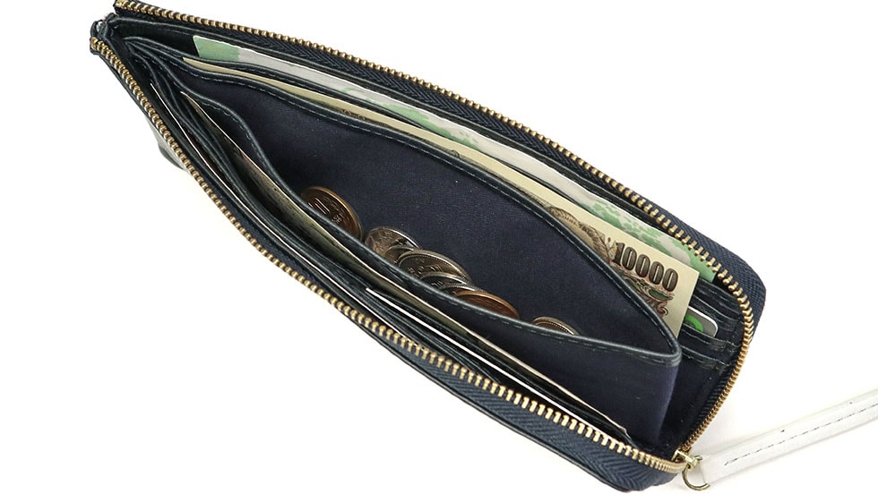 収納部は、中央の小銭入れが仕切りとなり、両サイドにお札をしまえるつくり。内側には豊富なカードポケットや、レシートなどの管理に便利なフリーポケットが設けられ、スリムなシルエットながら必要なものをしっかりとしまえます。